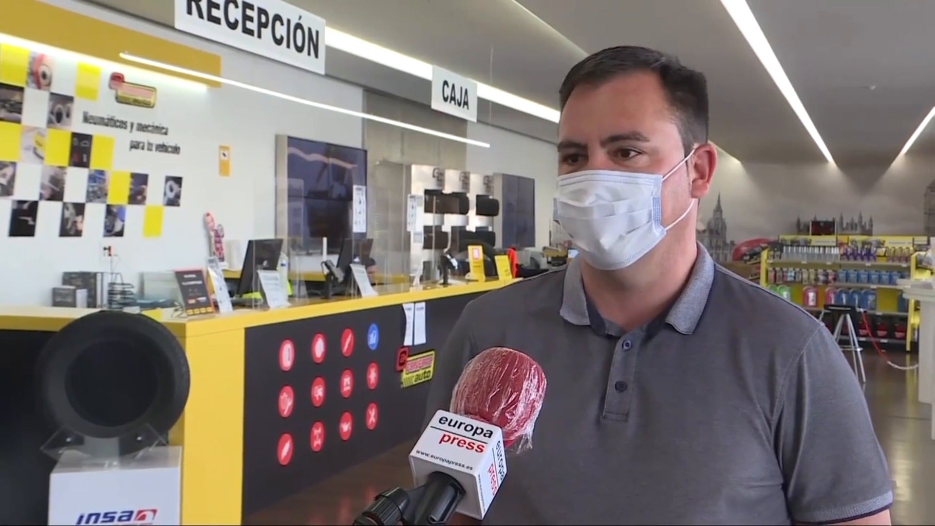 El mánager de Confortauto Neumáticos Soledad de Getafe, Raúl Fernández, ha explicado que, entre las medidas que en este taller han llevado a cabo para evitar la transmisión del coronavirus, se encuentran el procurar que los clientes mantengan la distancia de seguridad entre ellos