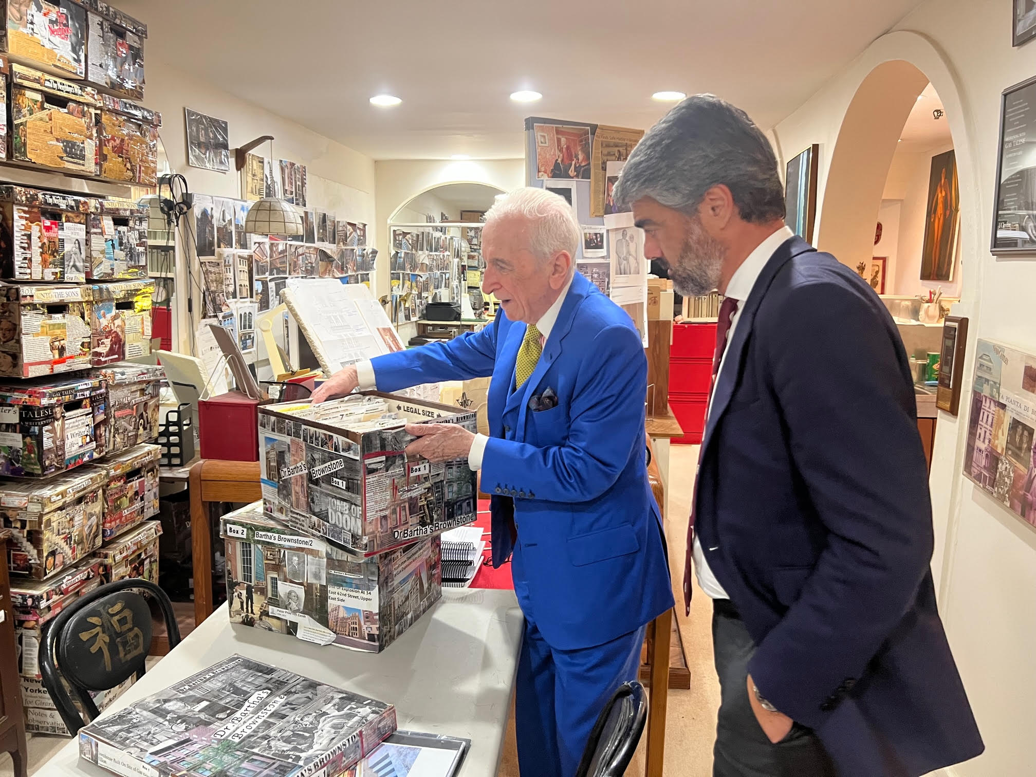 Terminada la conversación, vamos a llamarla así, nos regala una visita a lo que llama su «búnker». Aquella puerta a la altura de la calle efectivamente conduce a un sótano sin ventanas donde Talese guarda su vida. La escalera está protegida por una especie de mosquitera y, en una repisa a la derecha, una figura de Charlot y otra de Elvis dan la bienvenida a su refugio. Una vez abajo, los fluorescentes se encienden sucesivamente y van descubriendo una gran sala con estanterías llenas de cajas y carpetas. Cada caja guarda un trabajo y las tiene forradas con fotos y titulares mal recortados. Hay una cocina pequeña con una tetera y un sofá con toda la pinta de haber sido cama muchas noches en el pasado. A uno, le parecía estar en el cuarto donde un asesino en serie retiene a sus víctimas y se recrea en los titulares que provoca. «Tienes una mente bizarra». Pues será.