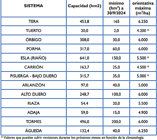 No obstante, a lo largo de este mes de abril se celebrarán nuevas sesiones de varias Juntas de Explotación, ya están fijadas las fechas para las del sistema Pisuerga – Bajo Duero (10 de abril) y Carrión (25 de abril). A partir de los valores aprobados por la Comisión de Desembalse, las dotaciones orientativas máximas de agua por sistemas quedan como se indica en la siguiente tabla.