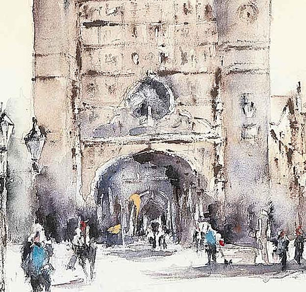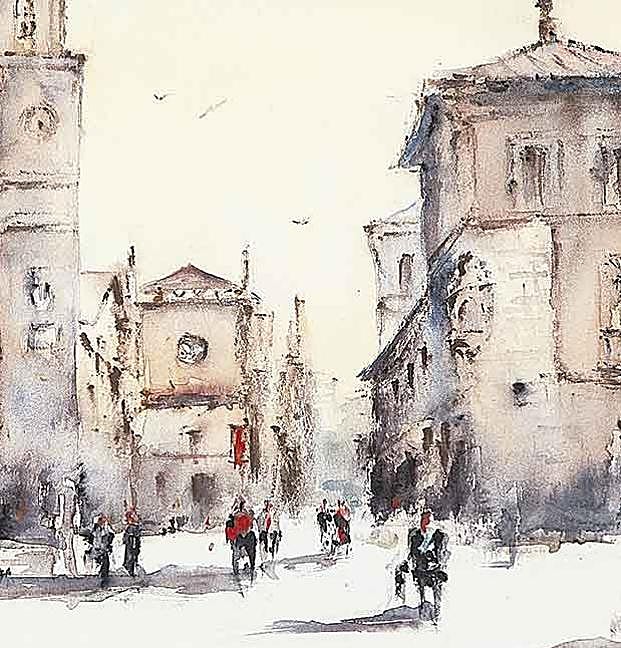 «Busco que el cuadro diga mucho con poco. Lo más complejo es la síntesis, decidir qué elementos quitar o añadir», resume la artista de 61 años, superventas local, siempre en acuarela. Evita el óleo porque le «aburre», prefiere la emoción de domeñar una composición expansiva en agua y pigmentos, jugando a remarcar y difuminar detalles como la ventana plateresca del Palacio de Pimentel donde nació Felipe II, ahora lugar entregado a la gestión de la acuciante despoblación provincial y también zona de paso a juicios y museos.