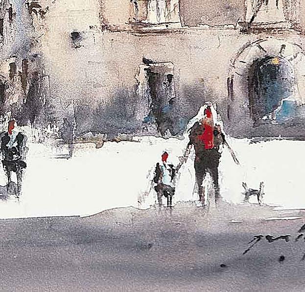 Con la punta del pincel o empleando una superficie plana, la artista hace barridos en la acuarela con el fin de difuminar figuras y objetos.