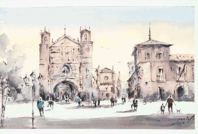 La acuarela de Isabel Menéndez desprende un aire de pretéritos esplendores traído al tránsito de un día corriente, al paso de figuras difuminadas que viven el prodigio de la normalidad, seguramente, con pensamientos ajenos a las historias que cobija el lugar. En el Colegio de San Gregorio se dirimió entre 1550 y 1551 la Controversia de Valladolid, primer esbozo de la Declaración Universal de los Derechos Humanos, pugna entre Fray Bartolomé de las Casas, defensor de los pueblos indígenas, y Ginés Sepúlveda, teólogo defensor del sometimiento de los indios. Luminosidad y sombras, como las que en el cuadro se esparcen en la acuarela del suelo al cielo y alrededor de figuras de vocación paseante.