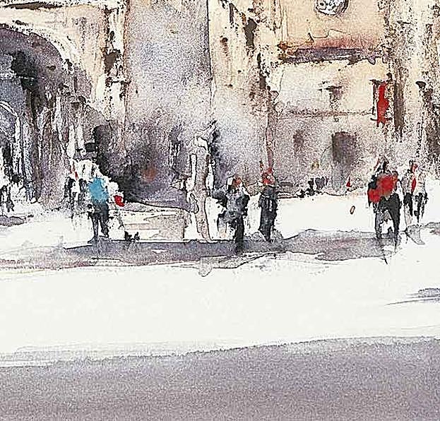 La pintora ha buscado el contraste entre el cromatismo oscuro del suelo en primer plano, punteado de sombras que cobijan a los viandantes, con el color carne y grisáceo del cielo. «Hay que trabajar de claros a oscuros, si te pasas con las veladuras se pierde la transparencia», advierte Isabel Menéndez.