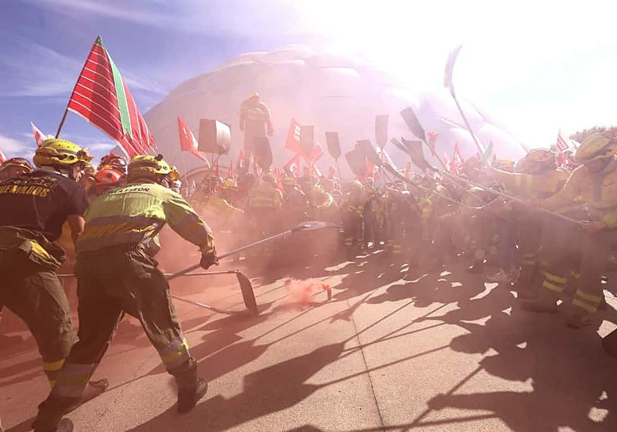 Las consignas más coreadas han sido «Mañueco, da la cara», «Da la cara, Mañueco, si no es por nosotros, que sea por los muertos», «Mañueco, cabrón, trabaja de peón», esto mismo pero poniendo el apellido del responsable de Medio Ambiente y «Mañueco, Quiñones, dimisión», mientras un grupo de manifestantes quemaba dos monigotes con el traje de bombero en la plaza. La tensión ha ido en aumento y algunos han empujado una parte de las vallas hasta derribarlas, lo que ha llevado a los agentes antidisturbios a usar las porras y el spray para impedir que sobrepasaran el cordón. La reacción de la masa ha sido el lanzamiento de objetos de todo tipo, desde pintura roja –que ha manchado la fachada de las Cortes– a barras de metal, plásticos y potentes petardos a los pies de los efectivos de seguridad. Tras un conato de carga policial que finalmente no se ha producido, las voces han tornado a «Manos arriba, esto es un atraco» y «Menos porras y más batefuegos», los mismos con los que han golpeado reiteradamente el suelo para hacer patente su descontento.