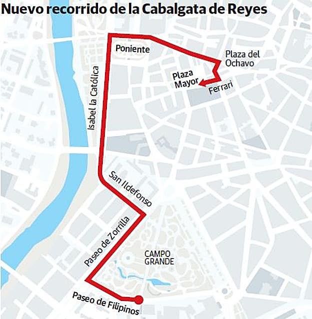 Sus majestades Melchor, Gaspar y Baltasar estarán acompañados este año por estrellas marinas, medusas o peces en un desfile que partirá de Filipinos para discurrir por el Paseo de Zorrilla, San Ildefonso, Isabel La Católica, plaza de Poniente, Ochavo, calle Lonja, Quiñones y Ferrari y finalizar en la Plaza Mayor, sobre las 20:00 horas, con la tradicional ofrenda en el Belén y el saludo desde el balcón de la Casa Consistorial.