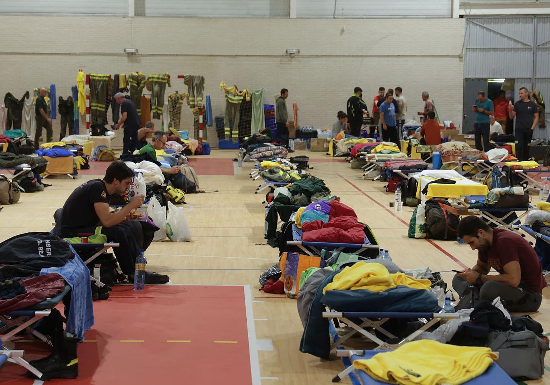La viva imagen de los cuatro bomberos forestales de Ávila se pierde en un inmenso pabellón de 200 camastros (una lona con seis patas) que sobrepasan las líneas de fuera de banda de la cancha deportiva. Hasta por las gradas hay efectivos de algún punto de la comunidad. Una imagen que recuerda a la de los campos de refugiados. De los que huyen de sus casas ante el temor de perder la vida. «Fue mi primera impresión nada más entrar por la puerta», recalca Pablo Castro, bombero del Ayuntamiento de León, mientras corta momentáneamente la conversación con su familiares en tierras leonesas. Se encuentra en la esquina contraria a la de los cuatro abulenses. Tal vez no se conozcan; quizás lo hagan en los próximos días, pero su mensaje es el mismo. «Hay que soportar un poco lo que es vivir en este tipo de comunidad tan grande, pero se lleva bien. Hay mucha humanidad entre nosotros, al final nos conocemos todos y a todos nos une el mismo fin, que es venir a echar una mano», continúa, antes de afrontar una nueva noche.