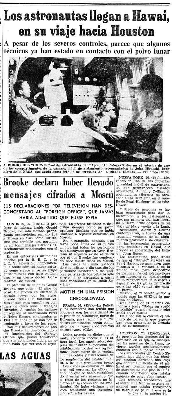 Mientras Juan Carlos de Borbón se convertía oficialmente en el sucesor de Francisco Franco en la jefatura del Estado español tras su juramento en las Cortes, el mundo se disponía a recibir a la expedición del Apolo XI. El portaaviones Hornet estaba preparado para recuperar la cápsula y a sus tripulantes, con previsiones meteorológicas «aceptables»: olas de «alrededor de metro y medio de altura y vientos de diez a quince nudos por hora». Otro teletipo en páginas interiores se preguntaba si había terremotos en la Luna: «Los científicos de la NASA han dicho que el sismómetro ha radiado señales 'o bien de un terremoto lunar o del impacto de un meteorito sobre la superficie de la Luna'», según quedó registrado durante el paseo de Armstrong y Aldrin.