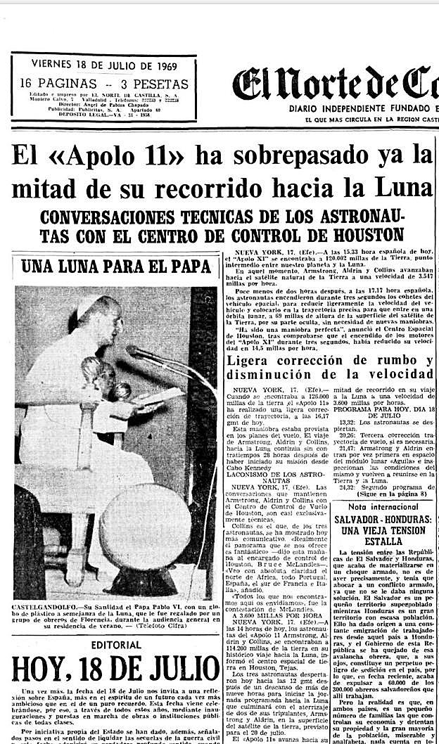El viernes 18 de julio, El Norte de Castilla ofreció más detalles del viaje. A una velocidad de 5.708 kilómetros por hora, el Apolo XI llegó al punto intermedio del viaje a las 15:33 hora española del día anterior. «Las conversaciones que mantienen Armstrong, Aldrin y Collins con el Centro de Control de Vuelo de Houston son exclusivamente técnicas. Collins es el que, de los tres astronautas, se ha mostrado hoy más comunicativo». El Norte también informaba de protestas en Italia contra el viaje, protagonizadas por «parejas jóvenes en nombre de todos los enamorados del mundo». Las pancartas decían: «Dejad tranquila la Luna», «La Luna es de los enamorados», «Fuera las manos de la Luna» o «Viajen a Marte».