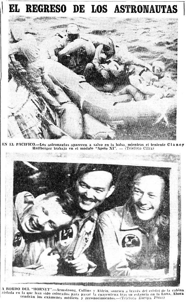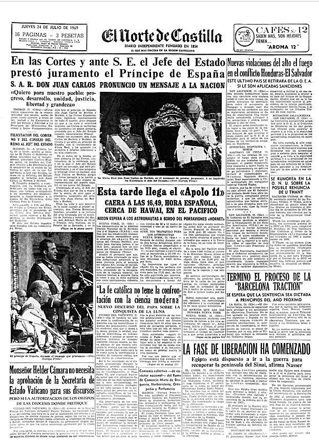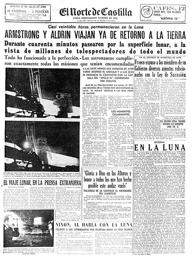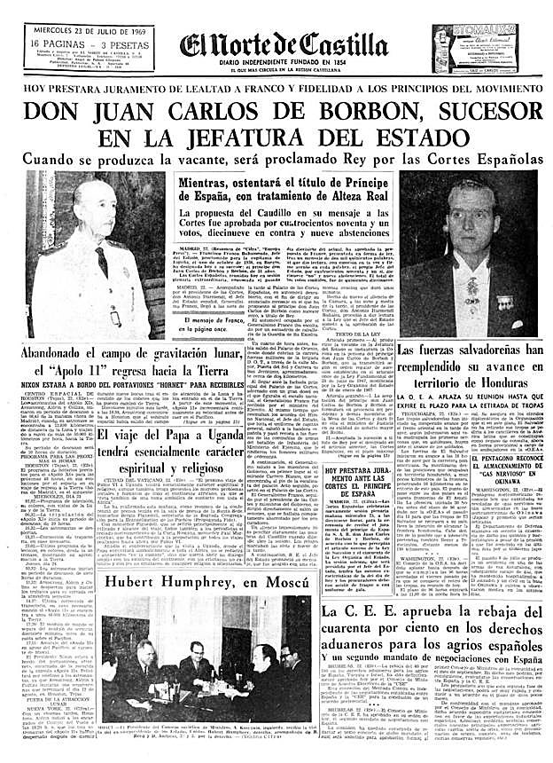 La designación del entonces príncipe Juan Carlos de Borbón y Borbón como sucesor de Francisco Franco en la jefatura del Estado español relegó el vuelo de vuelta del Apolo XI a un segundo plano en El Norte de Castilla del 23 de julio de 1969. Las Cortes aprobaron la propuesta del dictador por 491 votos a favor, 10 en contra y 9 abstenciones. Mientras, el Apolo XI había dejado el campo de atracción de la Luna para entrar en el de la Tierra y el titular de la crónica del enviado Armando Fernández-Xesta avisaba: «Los astronautas del Apolo 11 podrían permanecer enclaustrados de por vida». «No tenemos ni idea de qué gérmenes puedan traer consigo. Hemos tomado precauciones contra todo lo que conocemos», decían entonces los responsables de la NASA. No fue para tanto.
