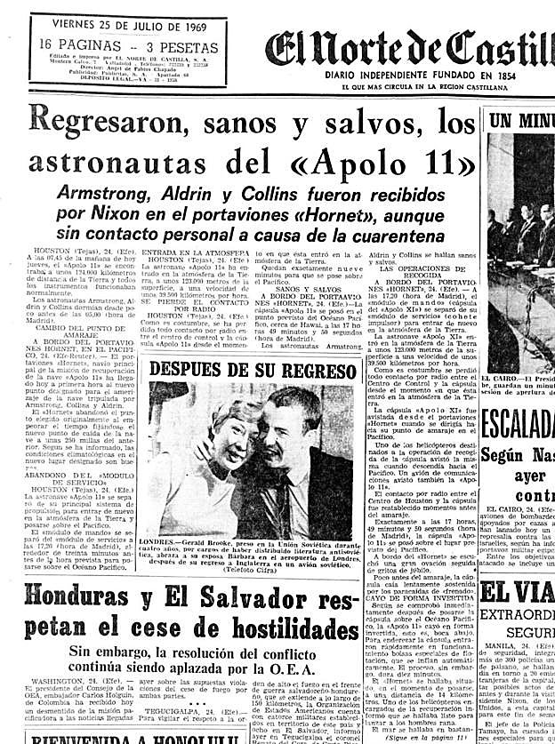 El sábado 26 de julio de 1969, los lectores de El Norte de Castilla pudieron ver las fotos de Neil Armstrong, Michael Collins y Edwin Aldrin de vuelta a la Tierra. Los tres aparecían sonrientes en la primera página del periódico dentro de la cabina aislada en la que debían pasar la preceptiva cuarentena tras su estancia en la Luna.