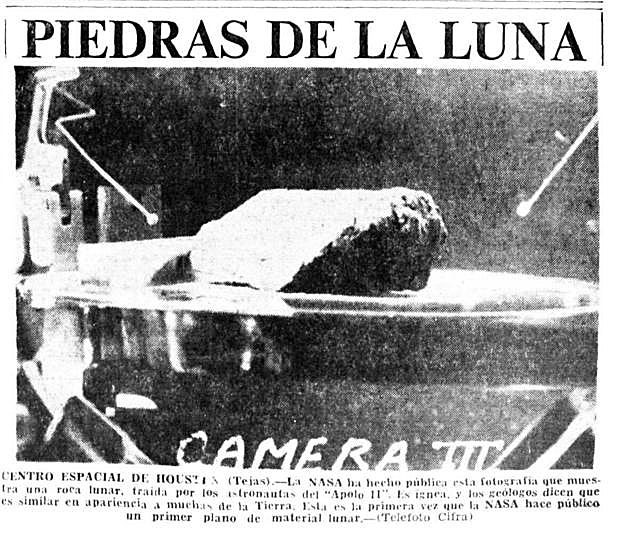 El martes 29 de julio de 1969, El Norte publicó una fotografía en primer plano de una roca lunar. «Es ígnea y los geólogos dicen que es similar en apariencia a muchas de la Tierra», rezaba el pie de foto. En las muestras se detectaron «lava, polvo de roca y pequeñas burbujas cristalinas».