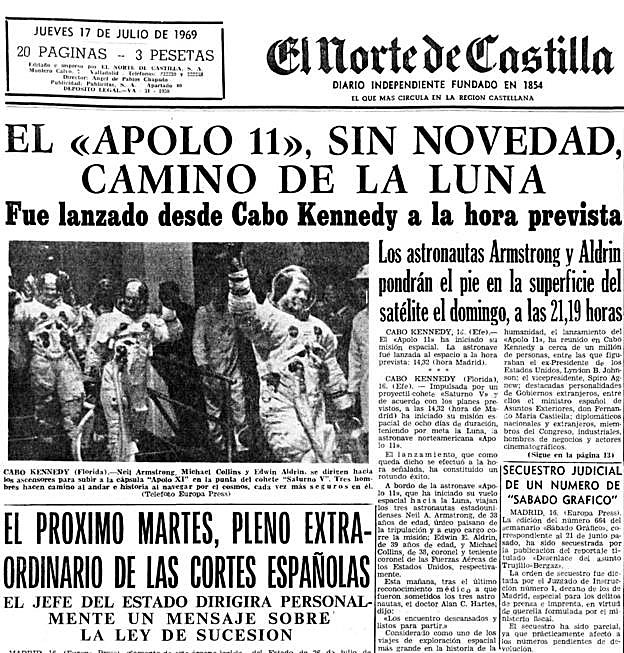 El miércoles 16 de junio de 1969, El Norte llevaba en las tres columnas de salida de la primera página el comienzo de un desafío apasionante. «Armstrong, Aldrin y Collins están preparados para iniciar su viaje hacia la Luna a las 13,32 (gmt) del miércoles. Los astronautas dedicarán el día de hoy a descansar y repasar los detalles de la misión que llevará a los dos primeros a la superficie de la Luna», recogía el teletipo de Efe, fechado el día anterior.
