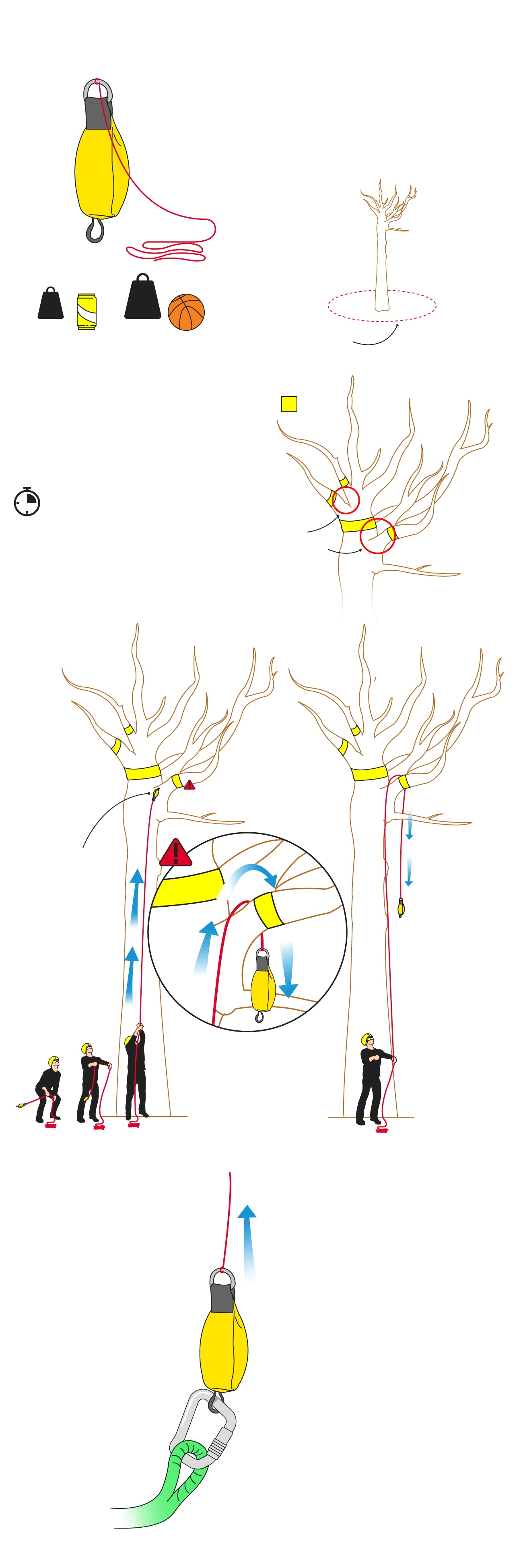 Cuando la hondilla está al alcance del lanzador éste, ayudado por un mosquetón, engancha una cuerda de trepa al otro extremo de la hondilla para después tirar del otro extremo, haciendo que la cuerda rodee la rama del árbol.