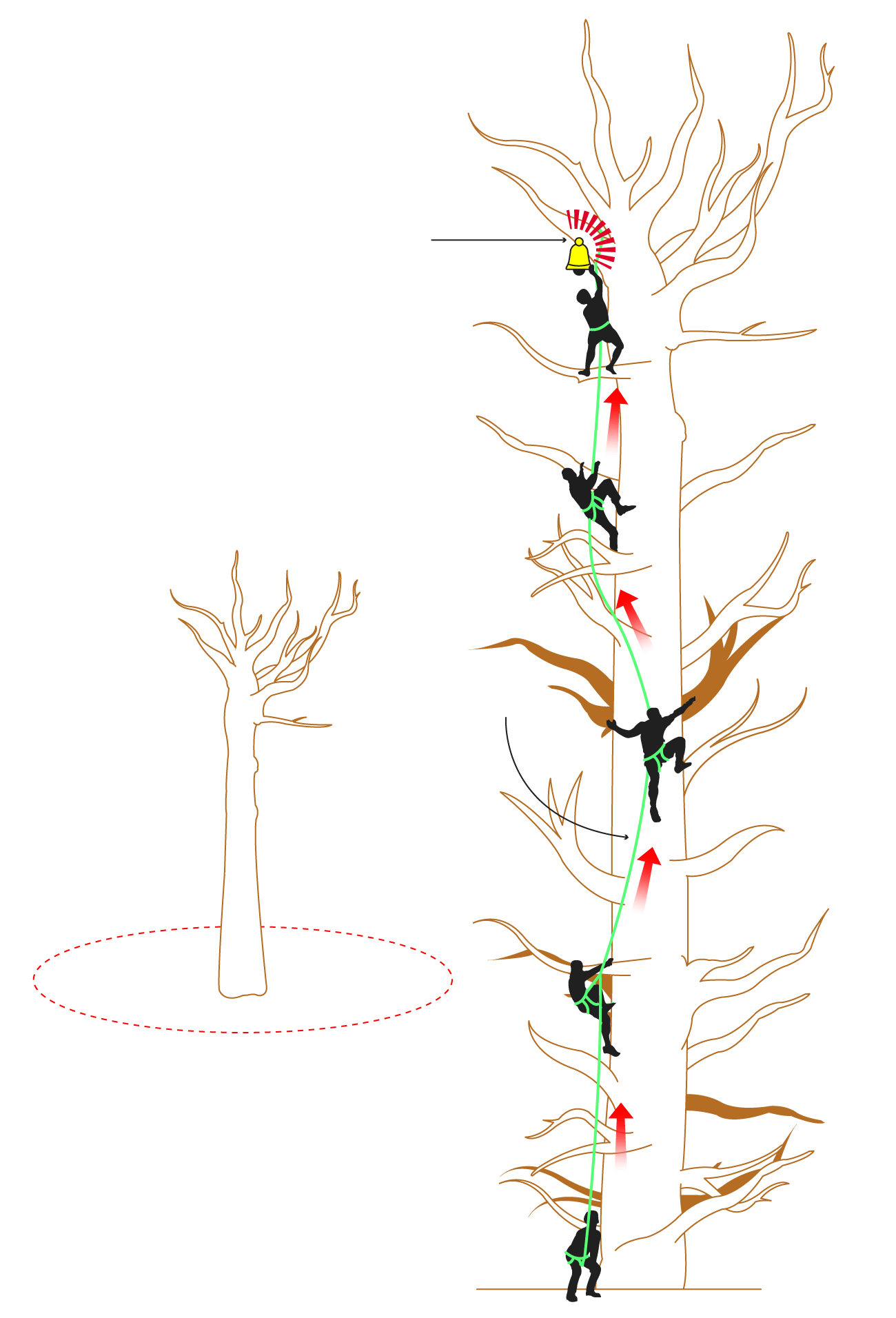 Esta prueba consiste en subir lo más rápido posible hasta hacer sonar una campana situada a 18 metros sin romper ninguna rama ni agarrarse a la cuerda de seguridad.