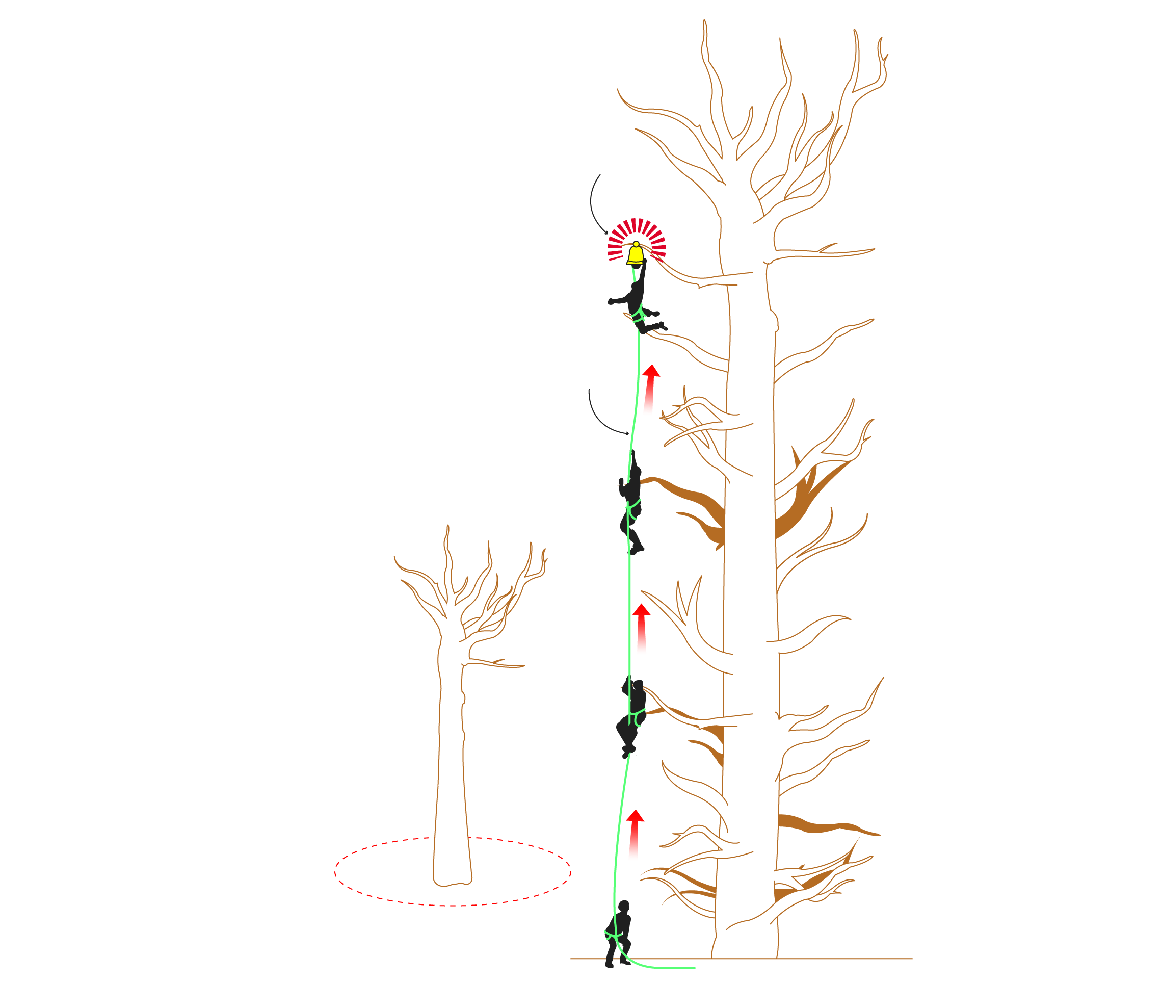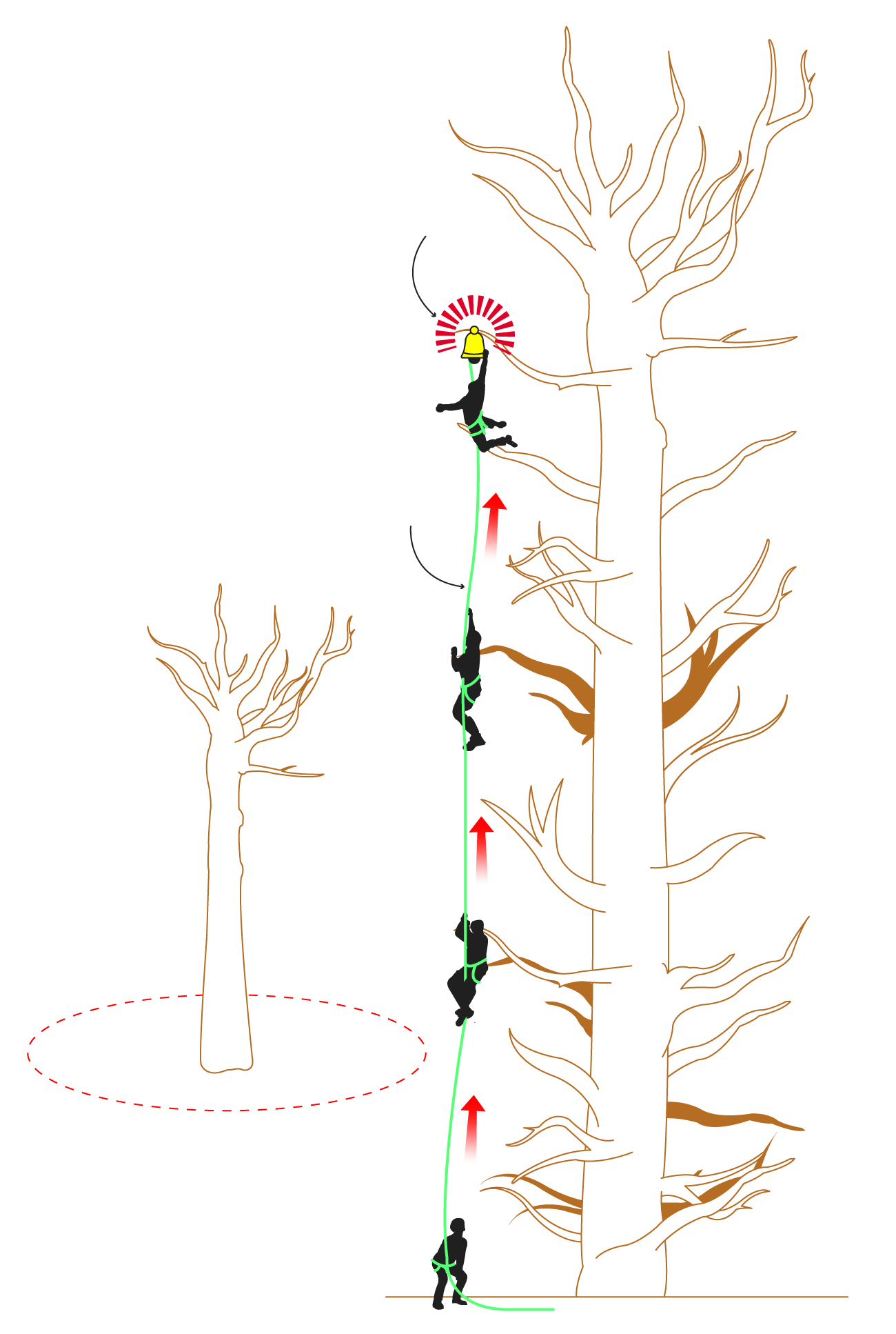 El arpirante deberá, en el mínimo tiempo posible, trepar por una cuerda asegurada en una rama y hacer sonar la campana que se encuentra en ella.