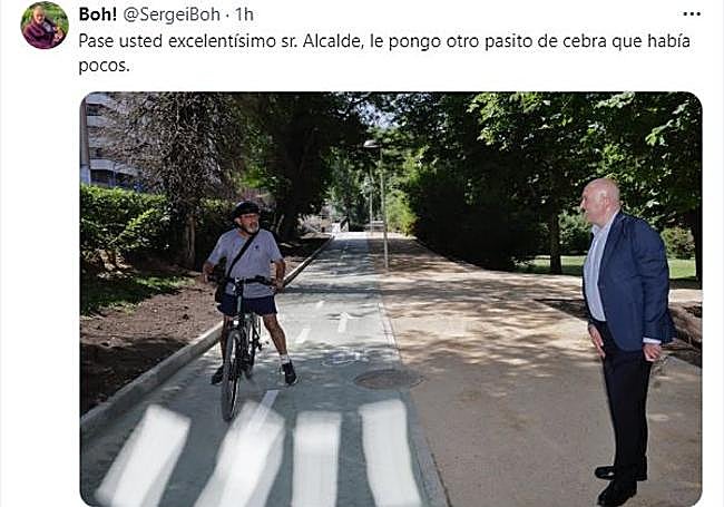 Los mensajes se dividen entre la pura crítica y los memes. En este último aspecto, el protagonista ha sido una imagen del alcalde de Valladolid, Jesús Julio Carnero, durante la inauguración y donde se le ve hablando con un ciclista que circula por la senda. Con esa base, el perfil @SergeiBoh ha pintado otro nuevo paso de cebra delante del regidor con el mensaje «Pase usted excelentísimo sr. Alcalde, le pongo otro pasito de cebra que había pocos». Otra broma más que juega con la idea del «carril cebra».