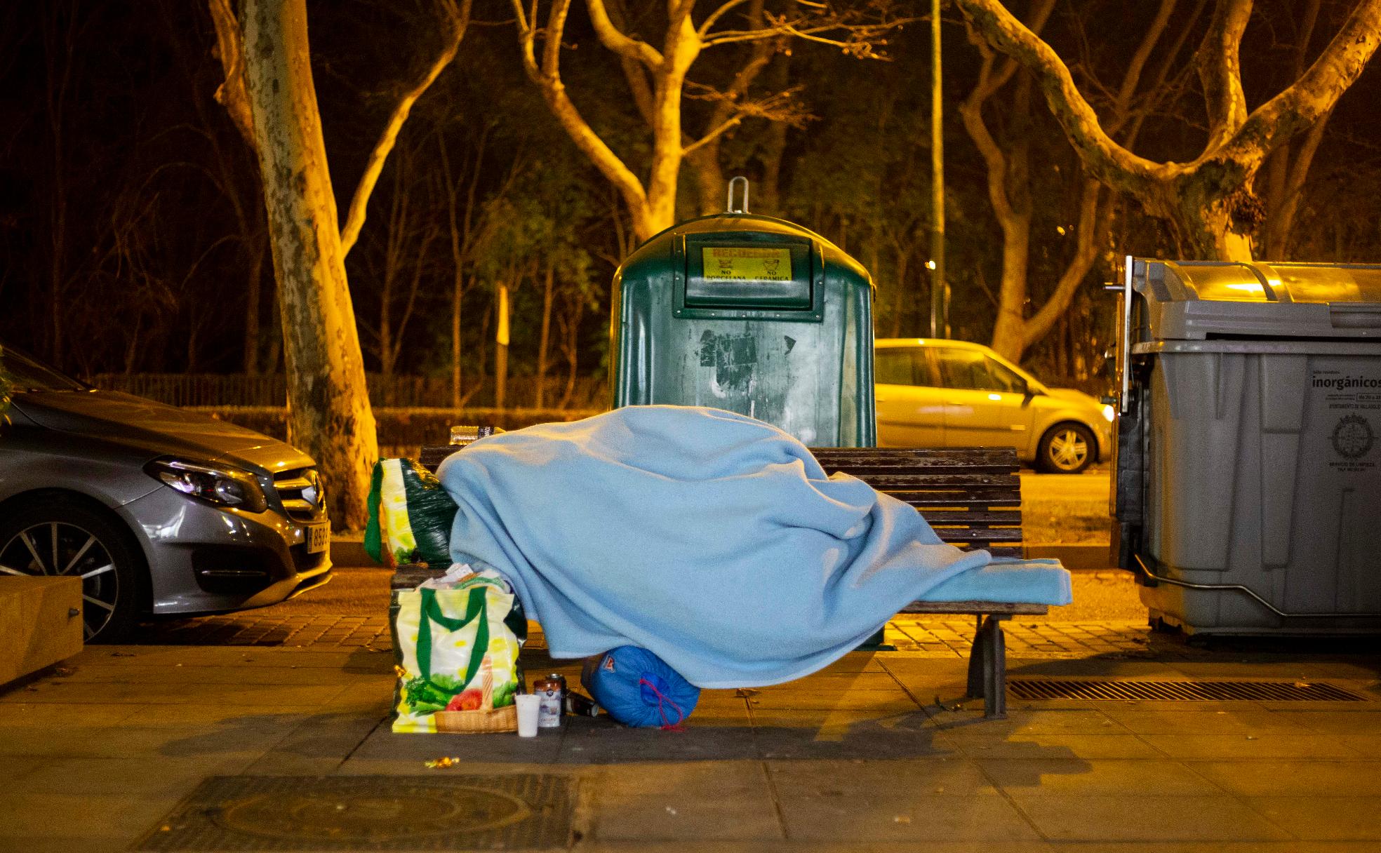 José Luis duerme a diario en la cama más fría de Valladolid. Su somier es un duro banco de madera. Una manta a cuadros, su única protección. A sus pies, todavía hay restos de nieve. Placas de hielo alrededor. Son las diez. El termómetro más cercano marca dos grados bajo cero. Y la noche no ha hecho más que comenzar. Esta madrugada, a las 6:30 horas, la temperatura se hundirá hasta los -5,2. Son las noches más gélidas del año para pasarlas a la intemperie. En plena ola de frío. Con la resaca del temporal 'Filomena' instalada en los huesos aún. Y aquí duerme José Luis, al raso, a merced de las heladas, sobre un banco callejero en la plaza Juan de Austria.