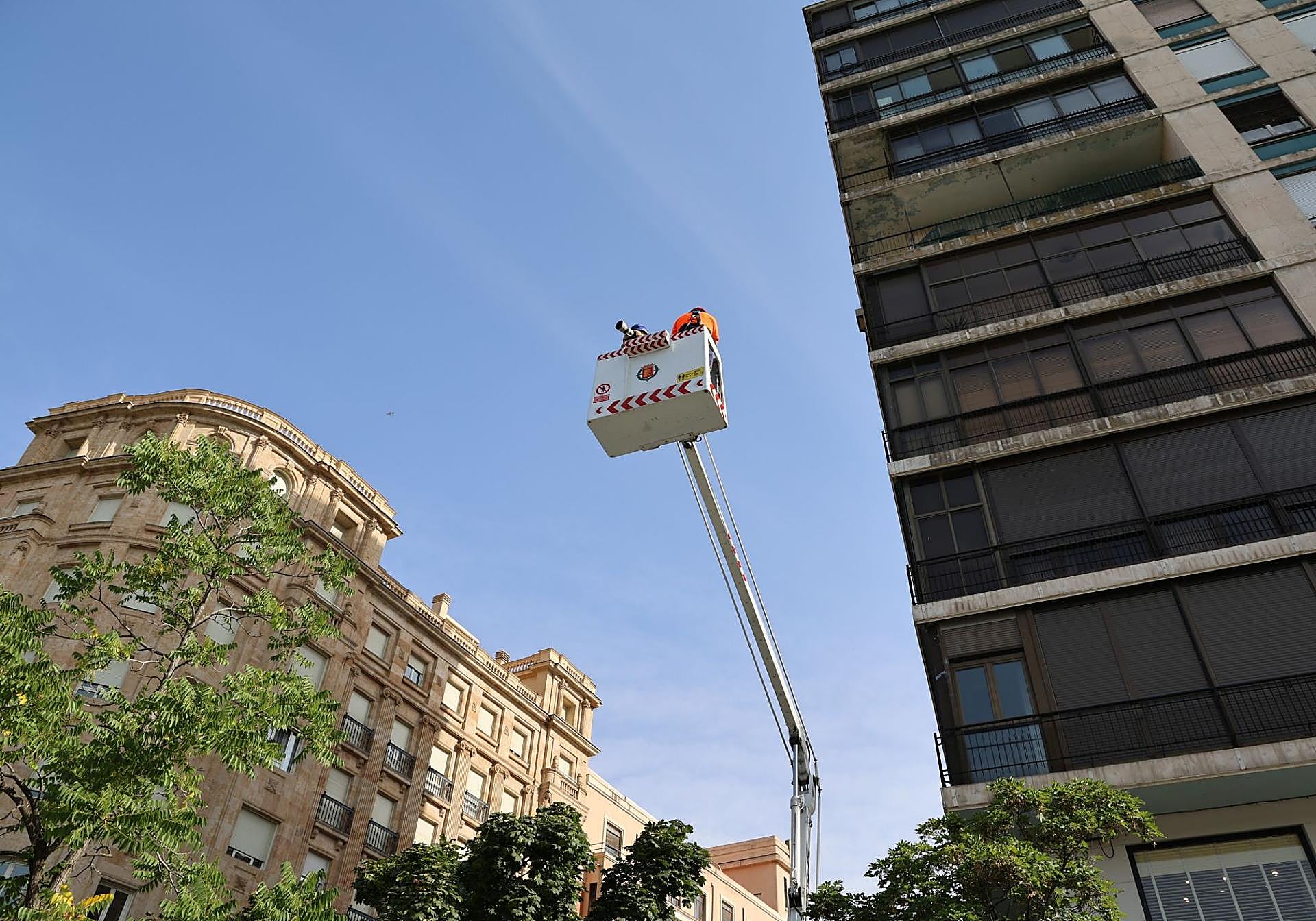 Una vez colocado todo el equipo de seguridad, uno de los operarios se queda abajo y otro sube junto al fotógrafo para manejar la plataforma desde lo alto. Tras buscar varios puntos de vista y probar diferentes alturas, Alberto no baja convencido del lugar. No es lo mismo estar en la plaza, a pie de calle, e imaginar lo que puede verse desde la grúa que lo que realmente capta la cámara. Definitivamente no. «Mucho metal», sentencia, refiriéndose al punto de estacionamiento de las bicis del servicio Biki y a alguna farola que se cuela en el encuadre.