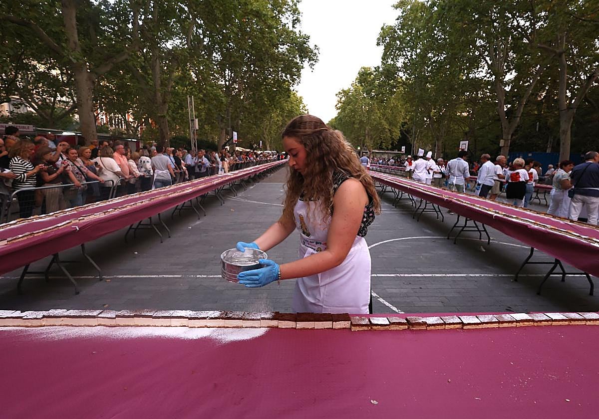 La tarta estaba pensada para todos. De hecho, unos 12 metros de ella, había sido elaborada sin gluten y sin lactosa. «Me ha hecho mucha ilusión participar. El bizcocho lo he hecho con almendra, harina de almidón de maíz y cacao, para que todo el mundo pueda disfrutar de ella», explicaba Macarena Sánchez-Colomer de L´Atelier Sin Gluten.