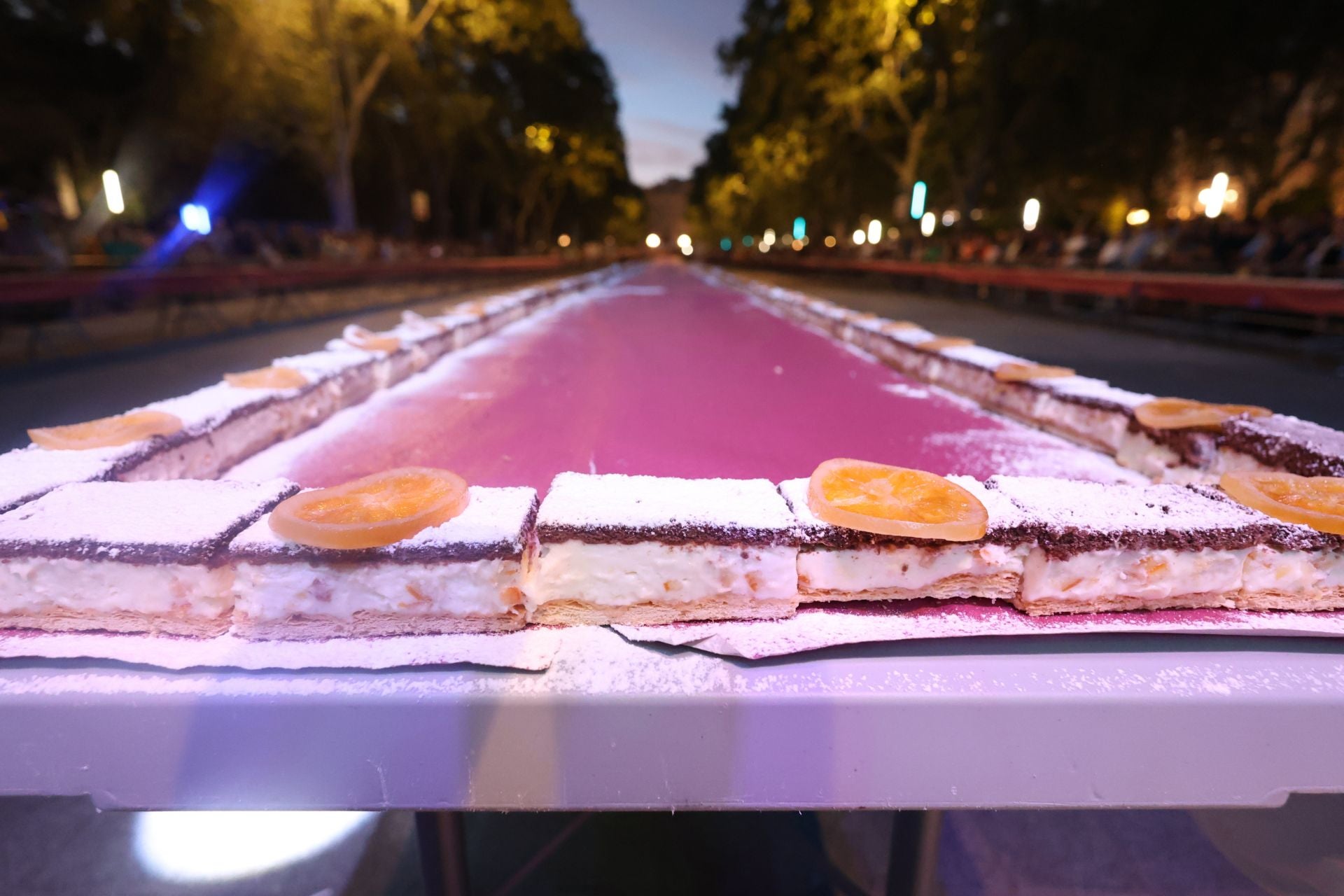 La línea de tartas con mayor longitud jamás hecha, con 360 metros y cerca de una tonelada, reúne a miles de vecinos en el Paseo Central del Campo Grande