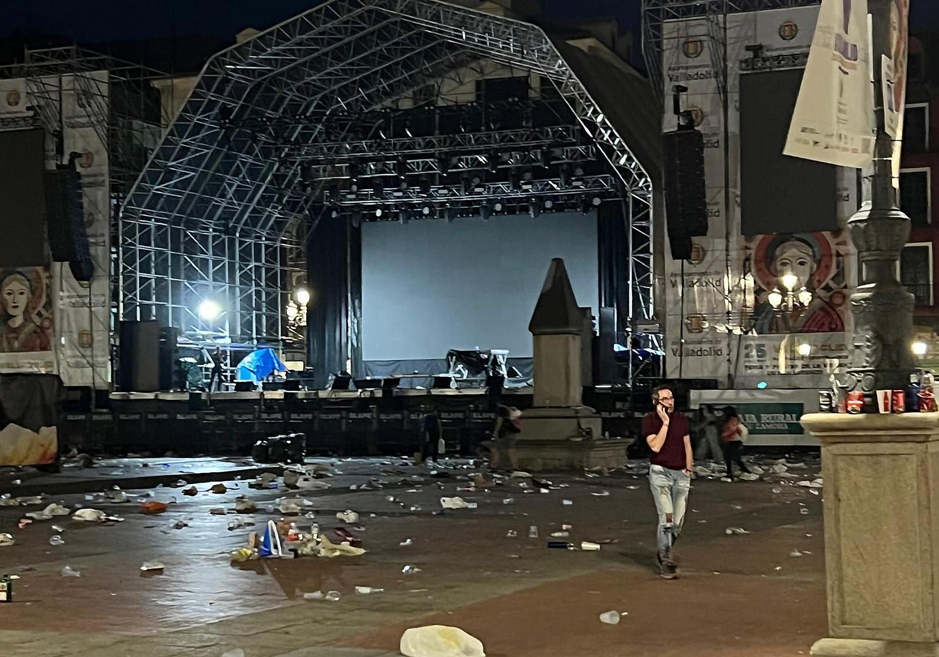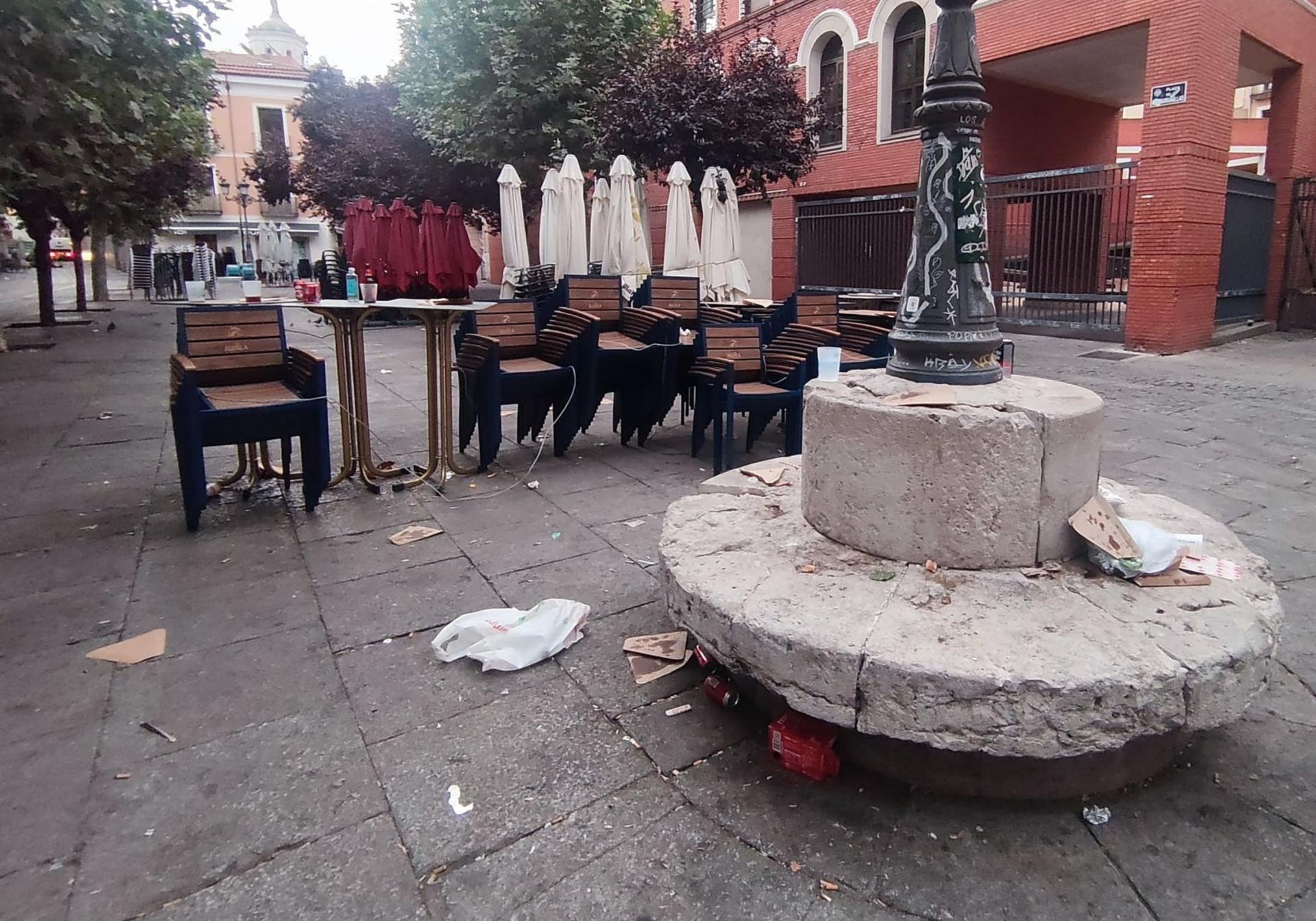 «Hemos mantenido el servicio diario de recogida de orgánico», advierte Alberto Cuadrado. En estas condiciones festivas, eso exige un esfuerzo brutal que lleva a tener en guardia a todos los empleados disponibles. Mientras un batallón se ocupaba de Las Moreras, otro se hacía cargo de la Plaza Mayor. Una compañera periodista enviaba a primera hora del domingo unas fotos: «Así quedó ayer la plaza después del concierto de Beret». En este caso un contenedor aparece lleno y a su alrededor, bolsas y residuos. Lo que no evita que el resto de la Plaza amanezca cubierto de basura. Otros trabajadores del Servicio, en parejas, se ocupan de barrer Poniente, por ejemplo, mientras entra el camión, y son las siete y media de la mañana, por Cantarranas, donde el espectáculo está en la farola, convertida en punto de depósito de mierda.