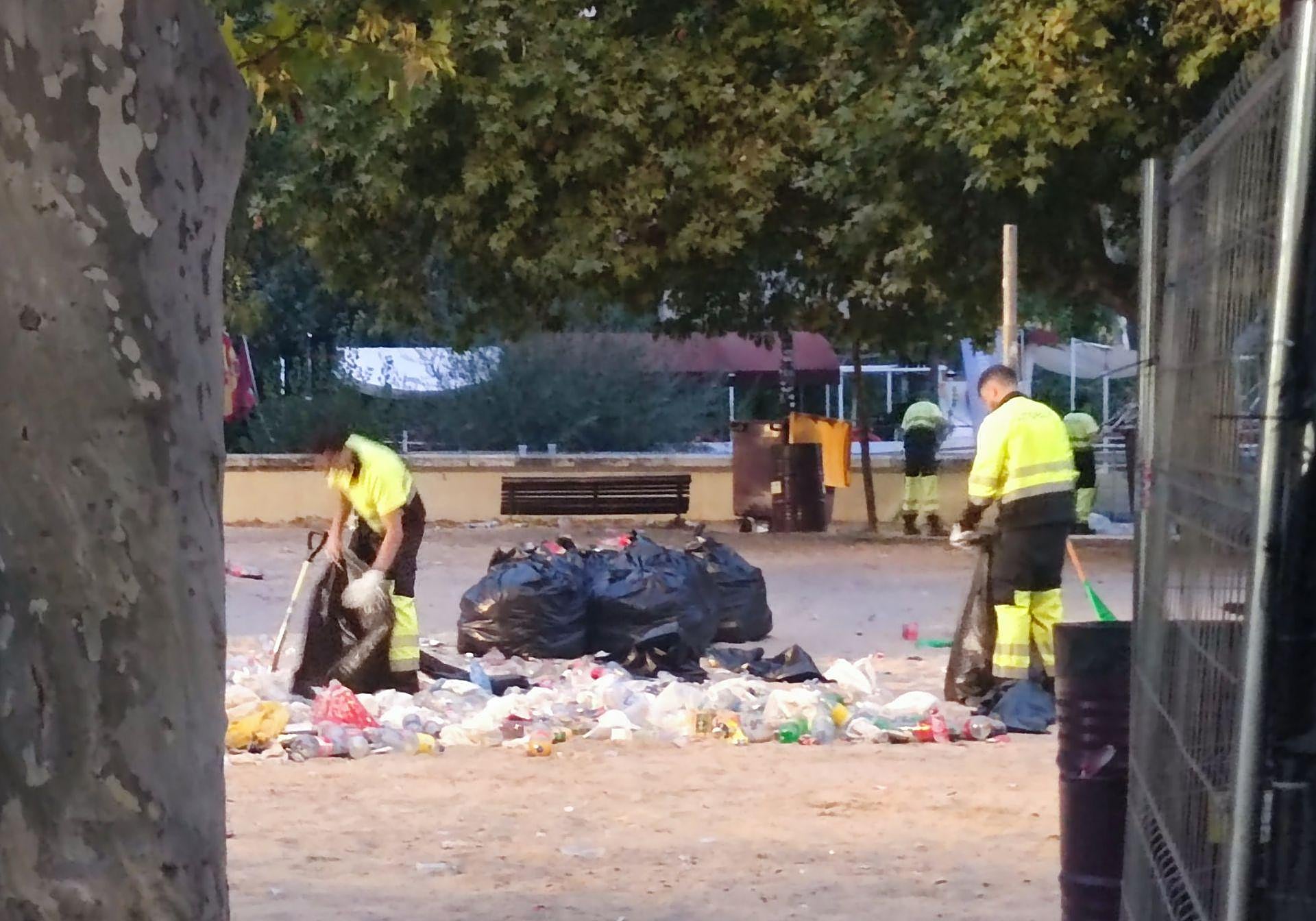 Solo en el desfile de peñas se recogieron 5.000 kilos de basura y 135 carros de la compra y zonas como Moreras amanecen con los contenedores vacíos y el suelo cubierto de residuos