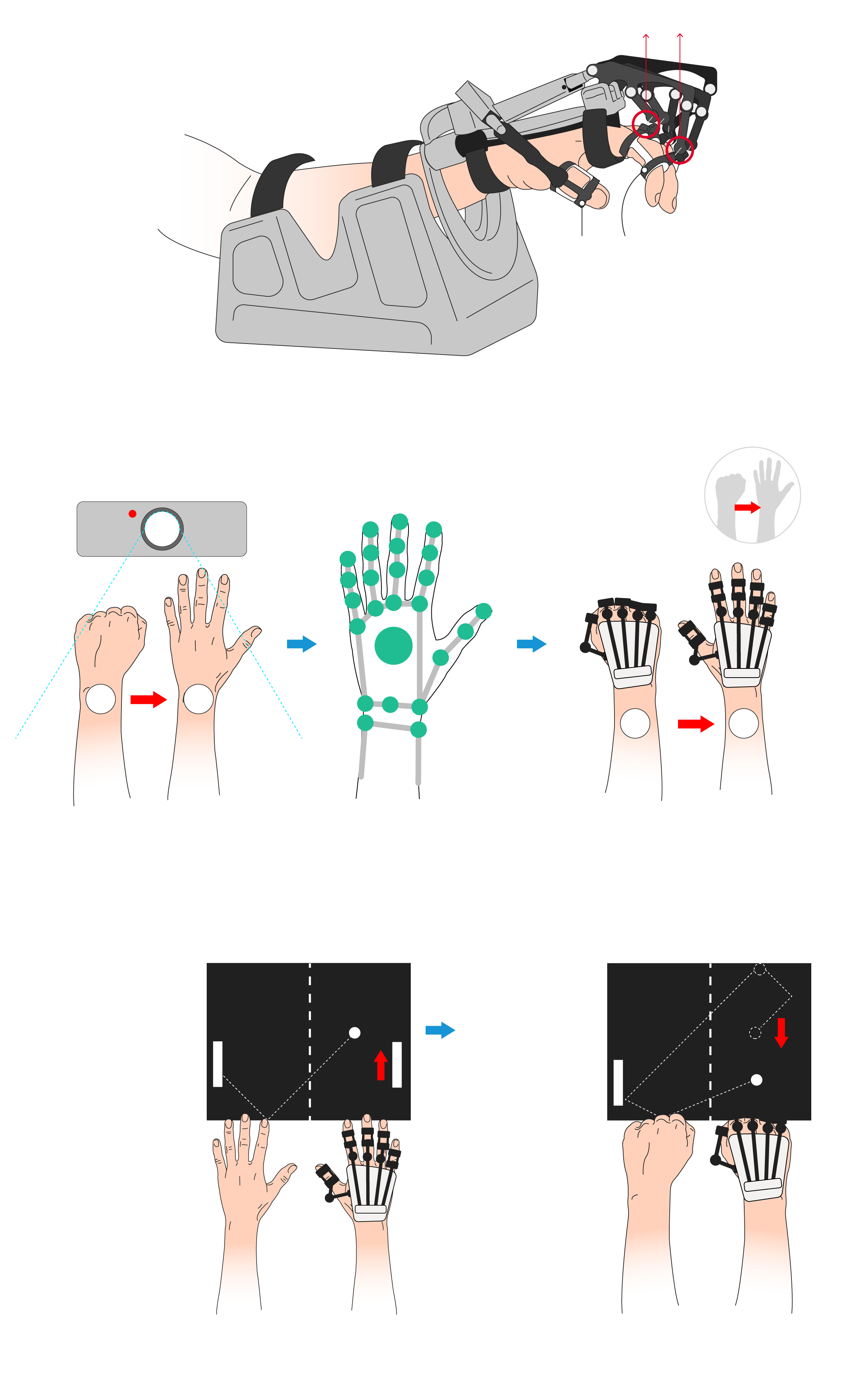 Se trata de un exoesqueleto que se adapta al tamaño de la mano de cada paciente mediante unos anillos flexibles en los que se introducen los dedos, que a su vez se unen al mecanismo motor mediante imanes.