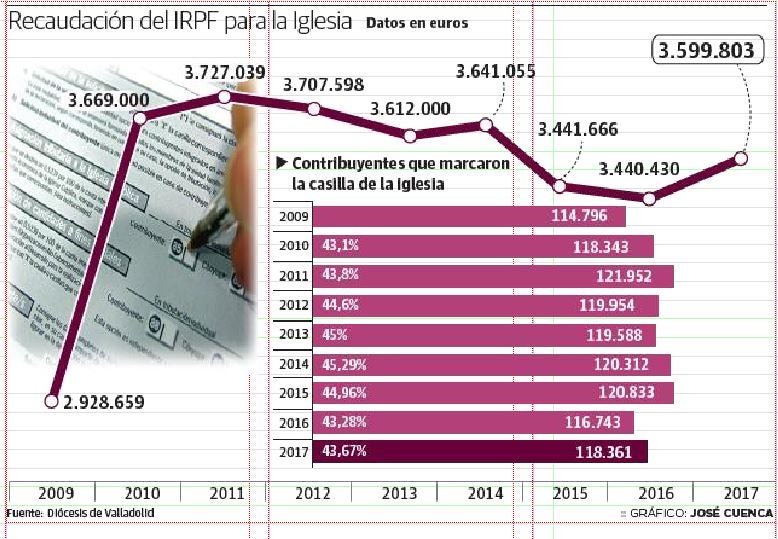 El 43,67% de los vallisoletanos que realizó la declaración de la renta correspondiente al IRPF del año 2017 marcó la equis en la casilla que asigna el 0,07% del impuesto a la Conferencia Episcopal. Es un porcentaje muy similar al del año anterior y se sitúa en la media de la última década, pero el número de contribuyentes que se decanta por la opción de la Iglesia creció ligeramente, un 1,36% para ser exactos, que se traduce en 118.361 personas frente a las 116.743 del año anterior.