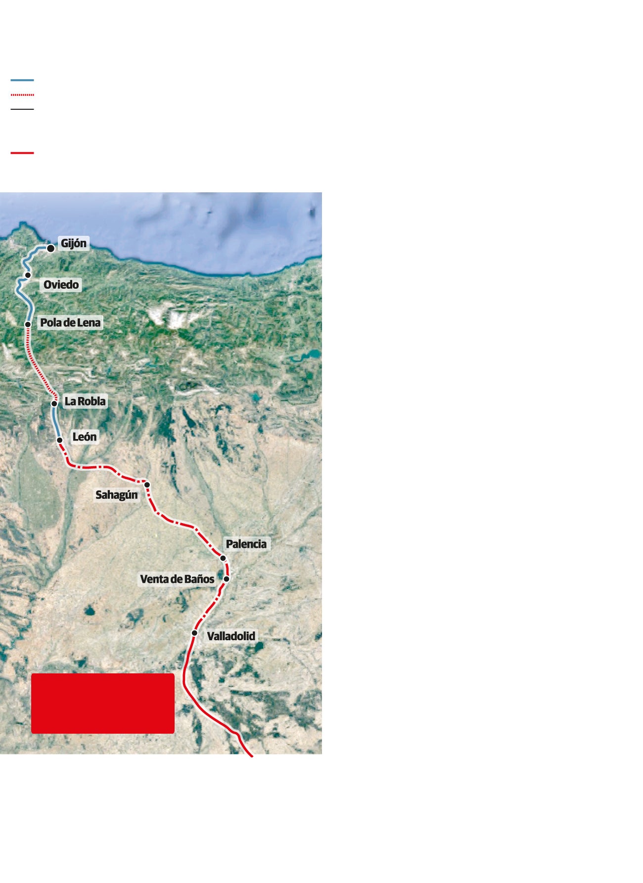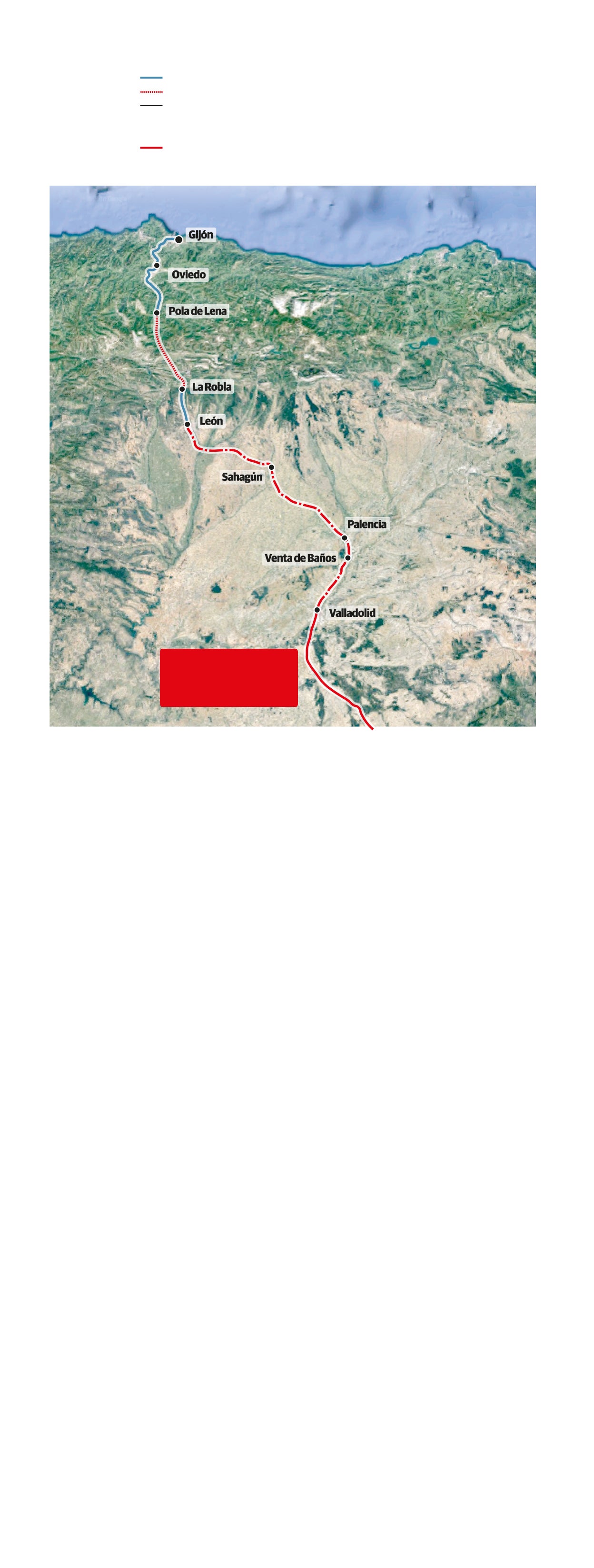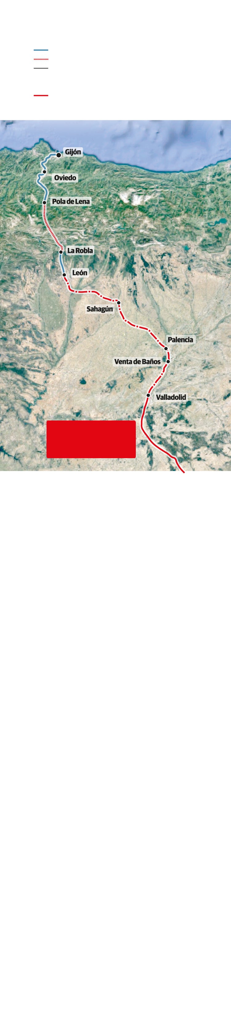 Por partes. Ahora mismo la conexión ferroviaria entre Gijón y Madrid se presta sobre una infraestructura heterogénea. El servicio Alvia que sale de Chamartín cuenta con línea de alta velocidad de doble vía entre Madrid y Valladolid. Son pajar estrenados en diciembre de 2007 con José Luis Rodríguez Zapatero como presidente, tras una inversión de 4.500 millones. La instalación se diseñó para tráfico exclusivo de viajeros, admite 350 kilómetros por hora de velocidad máxima y cuenta con vías de ancho estándar (1.435 milímetros de separación entre sus carriles). Está electrificada a 25.000 voltios de corriente alterna y cuenta con sistema de gestión ERTMS de nivel 2.