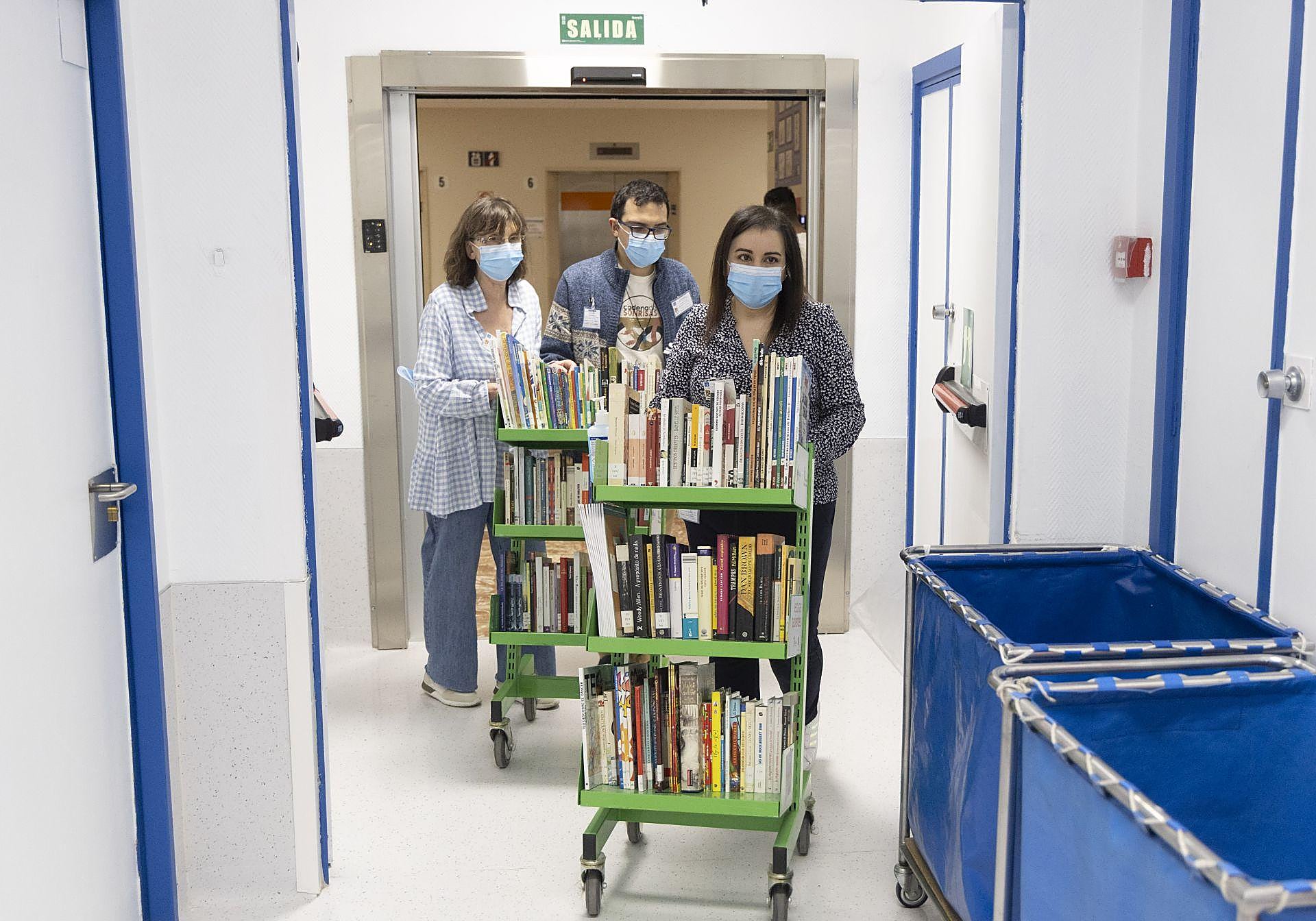 Inicialmente, la biblioteca del hospital estaba ubicada en un sótano, un lugar poco accesible para los pacientes. Con el tiempo, y gracias al esfuerzo de los voluntarios, se trasladó a la planta 12, un espacio abierto, junto a la capilla, donde cualquier persona, paciente o acompañante, puede acceder a los libros si ninguna restricción. Además, se implementó el servicio de biblioteca ambulante con carritos que cada día se cargan con nuevas lecturas para los pacientes ingresados. «Comenzamos en 2012 con el apoyo de la asociación Cadena de Sonrisas y su proyecto Pájaros de Papel, y a lo largo de los años hemos conseguido consolidar un servicio que los pacientes agradecen enormemente«, explica Laura Morchón, supervisora de Atención al Usuario y presidenta de la Comisión de Humanización del Clínico. «La actividad se vio interrumpida por la pandemia, pero una vez que todo volvió a normalizarse, retomamos el servicio, porque veíamos que era muy necesario y los pacientes lo estaban demandando», añade.