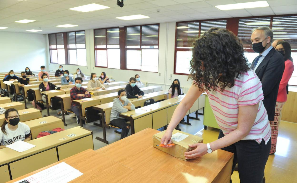 Mientras el rector se explica, los alumnos entran escalonadamente y por turnos en los clases del Aulario del Campus Esgueva. Alas nueve en punto, la presidenta del tribunal abre el sobre el presencia de alumnos, rector y prensa. «Y ahora, tranquilidad, serenidad y... contestar bien», les recomienda a los jóvenes. Una carcajada general parece distendir el ambiente estudiantil.
