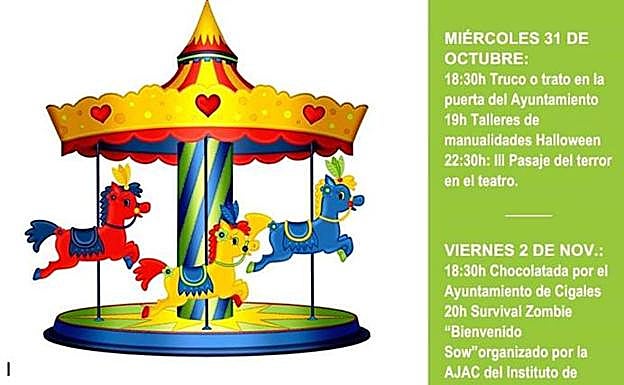 La celebración de Halloween se junta en Cigales con la Feria del niño, que se celebra del 31 de octubre al 4 de noviembre en la Plaza Mayor de la localidad donde se desarrollará un amplio programa de actividades y ubicará un recinto ferial. Este miércoles, 31 de octubre, a las 18:30 horas se celebrará el tradicional 'Truco o Trato' de la noche de Halloween en el Ayuntamiento seguido de un taller de manualidades de Halloween a las 19:00 horas. Después será el turno del 'Pasaje del Terror' en el Teatro Las Peñuelas a partir de las 22.30 horas. El viernes 2 de noviembre a las 18:30 horas se ha programado una chocolatada popular y a las 20:00 horas el Survival Zombie organizado por la AJAC y alumnos del IESO Cigales. El sábado 3 de noviembre a las 19:00 horas actuará el grupo infantil Zolocotropo con su espectáculo de animación infantil 'Tina ¡Ay que problema!' con canciones y magia participativa.