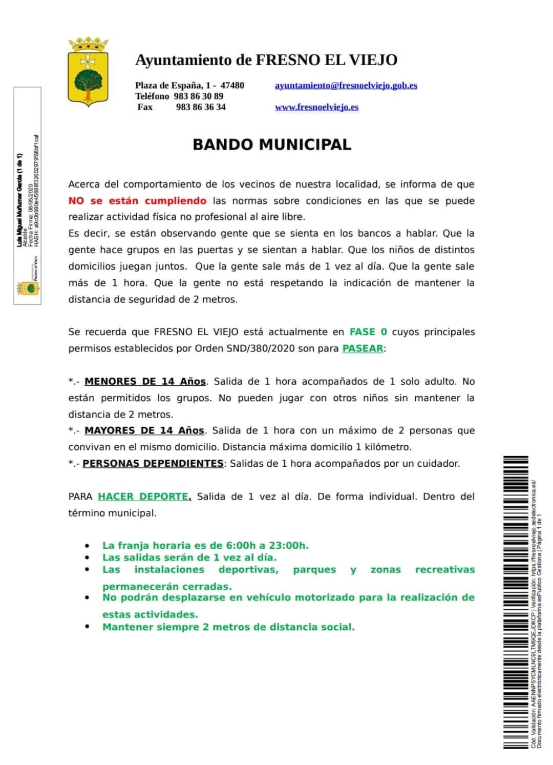 Los corros de amigos sentados a la fresca en un banco de la Plaza Mayor, las quedadas de niños de distintas familias que juegan por las calles, los vecinos que deciden alargar la hora diaria de paseo y mayores que realizan más de dos salidas al día y la falta de medidas de seguridad, sobre todo la distancia mínima de dos metros entre personas, son algunos de los comportamientos que los residentes en la localidad de Fresno el Viejo realizan desde que el pasado fin de semana se les permitirá salir a la calle durante 60 minutos al día. Ante esta «falta de orden» y «responsabilidad» el Ayuntamiento ha decidido emitir un bando municipal para informar a todos que «no se están cumpliendo las normas sobre las condiciones en las que se puede realizar actividad física no profesional al aire libre» y según explicó el alcalde, Luis Miguel Muñumer, «estamos en la Fase 0 y si esto sigue así no podremos pasar a Fase 1. Tenemos que ser mucho más responsables y darnos cuenta de la seriedad del coronavirus».