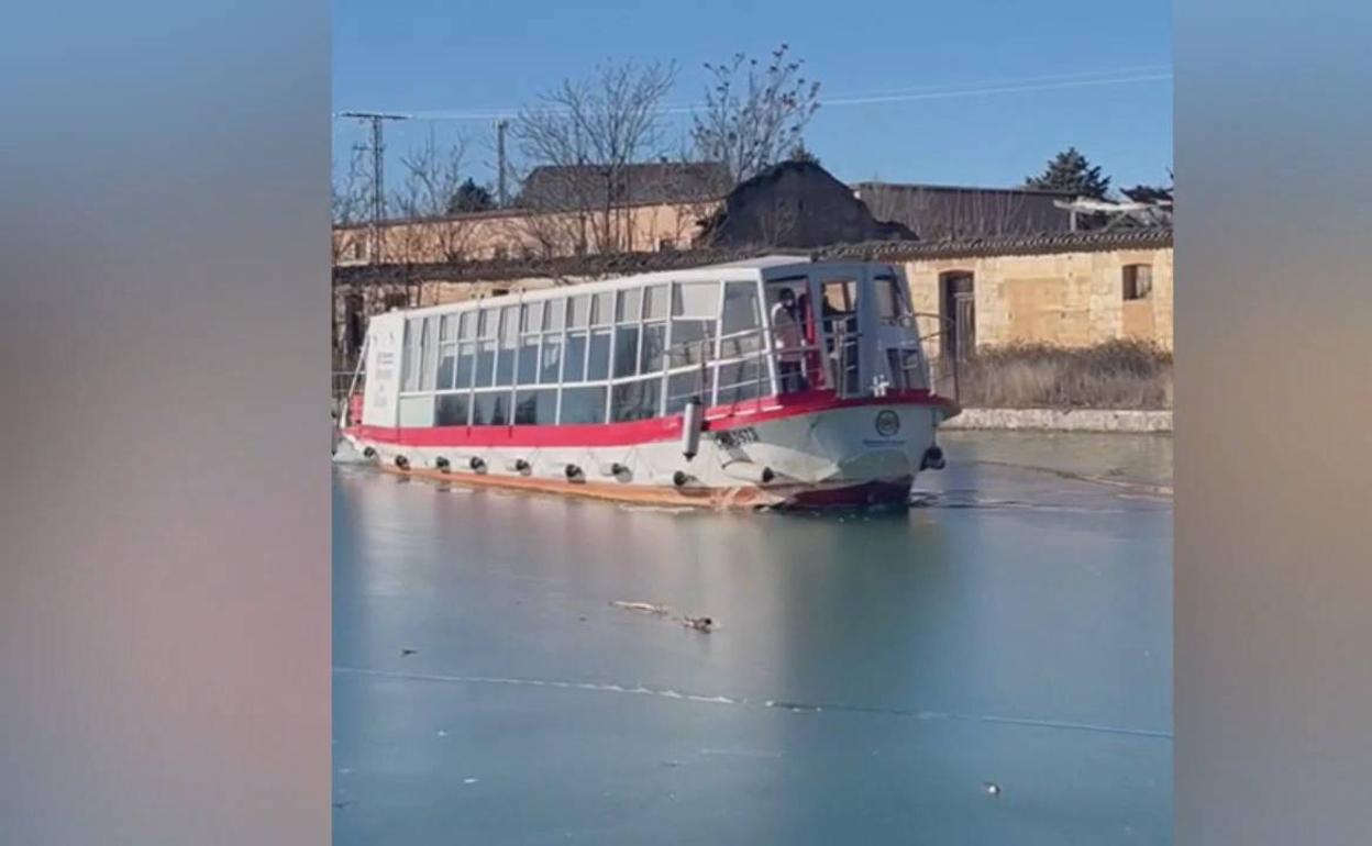 El barco del Canal de Castilla rompe el hielo a su paso por las aguas congeladas