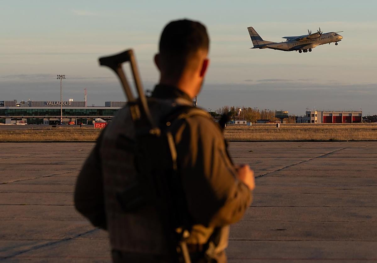 En la tarde de este miércoles, sobrevolaban el cielo de Valladolid dos Airbus A400 de los diez con las que cuentan las Fuerzas Armadas. Es la aeronave militar más avanzada, con capacidad para transportar hasta 37 toneladas. Ambos aterrizaban provenientes de la base militar de Zaragoza, cargados de vehículos terrestres y refuerzos de las unidades tácticas para completar la tercera fase de este entrenamiento, compuesto por ejercicios de paracaidismo y aterrizaje, que se prolongará durante dos jornadas más para probar las dotes sobre el terreno ante la presencia, en esta ocasión ficticia, de combatientes enemigos.