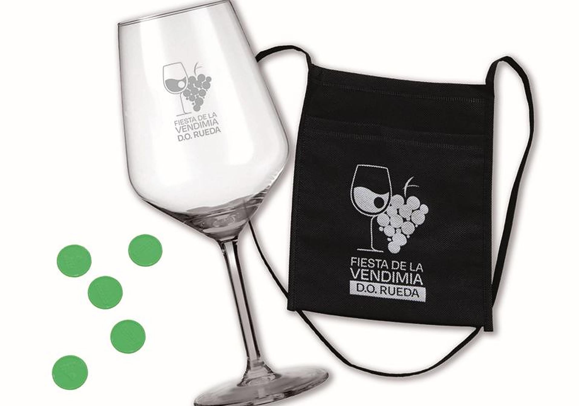 Qué incluye el kit de la Feria del Vino de Rueda (10€). Se entregará una copa de vino, un portacopas y cinco fichas de degustación de vino. En cada caseta, cada ficha podrá canjearse por un vino. Promoción válida hasta agotar existencias de copas. La venta de alcohol a menores de 18 años está prohibida.