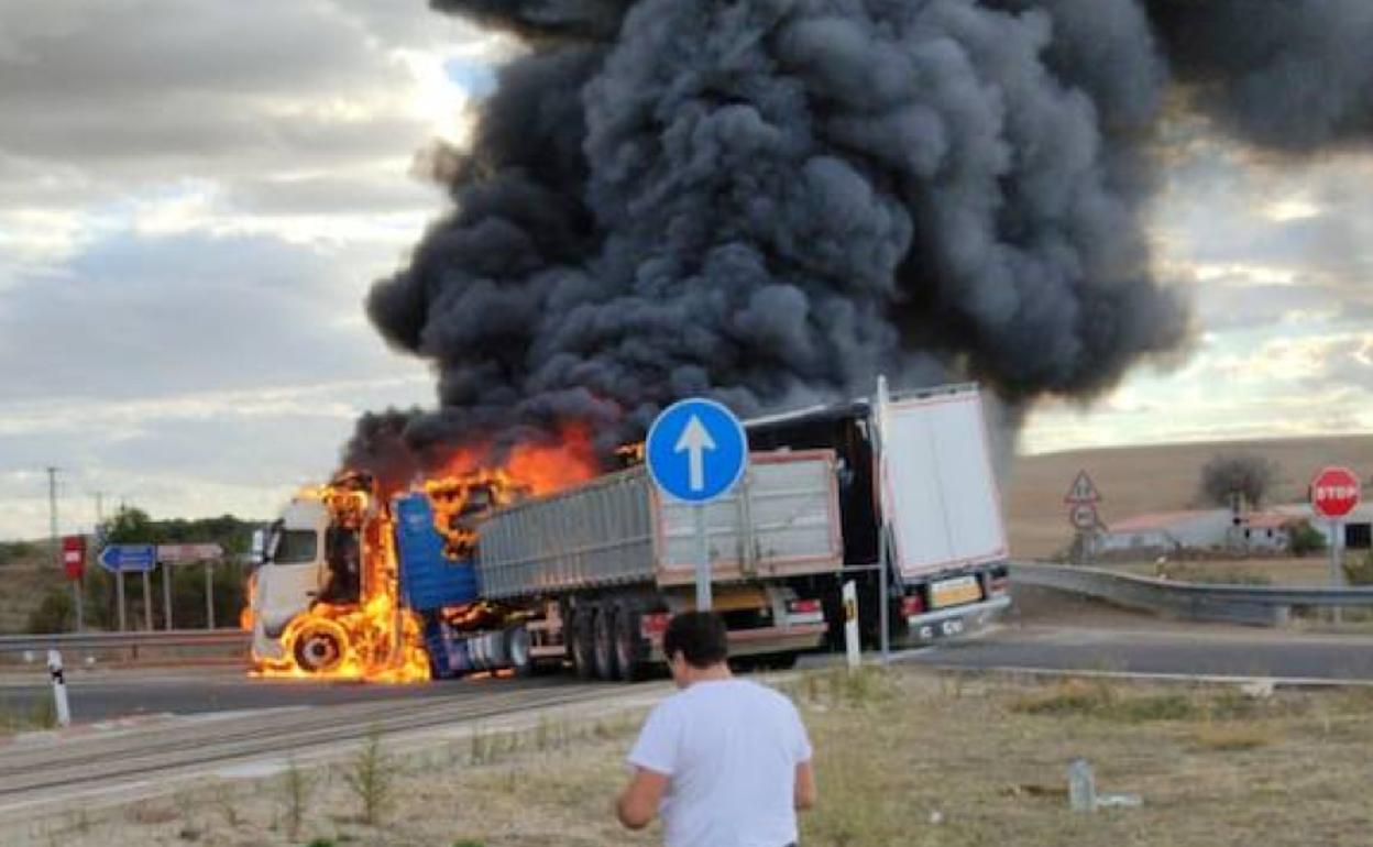 Una colisión entre dos camiones en el enlace de la Nacional 620 con la autovía de Salamanca (A-62) y la carretera que conduce a Pollos (VA-610) ha provocado un aparatoso incendio que ha acabado afectando a los dos vehículos implicados a las 18:20 horas de este jueves. El siniestro, que se ha saldado con un herido –uno de los transportistas implicados–, ha tenido lugar en la citada intersección, conocida como 'El Empalme', en el kilómetro 163 de la N-620, y ha obligado a cortar por completo la Nacional durante las labores de extinción y atención al lesionado. Uno de los camiones transportaba maderas y el otro llevaba la caja vacía.