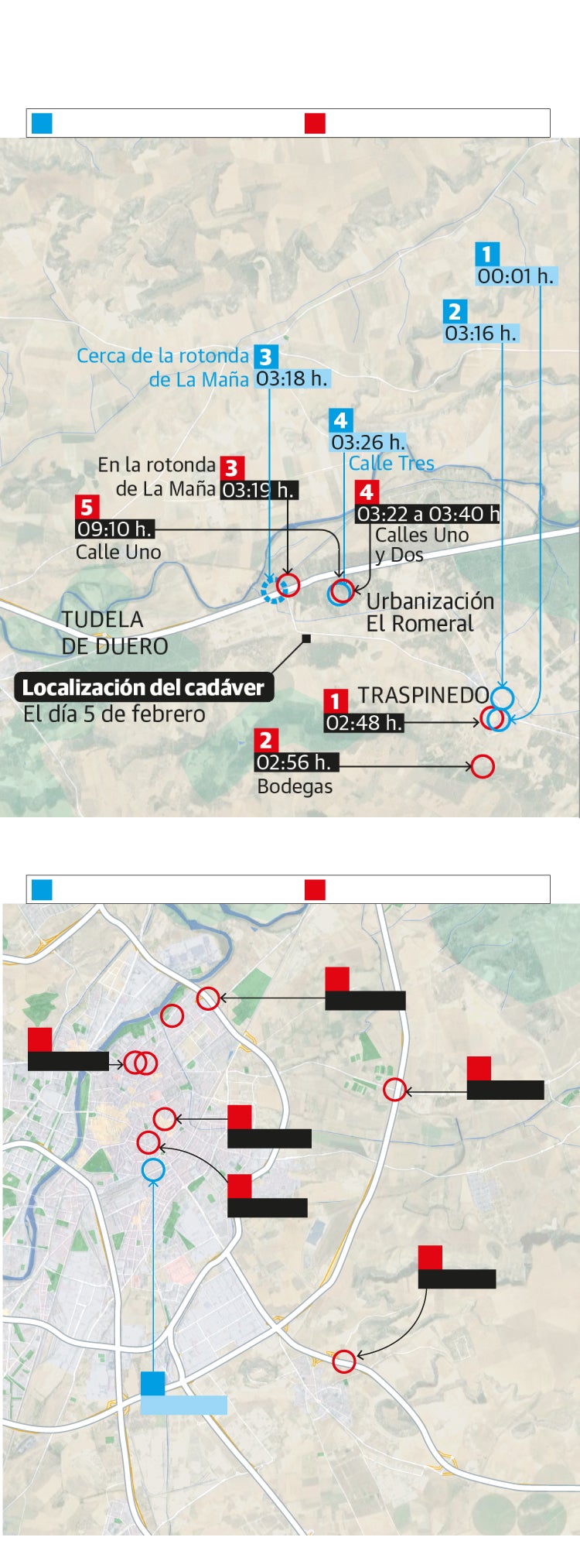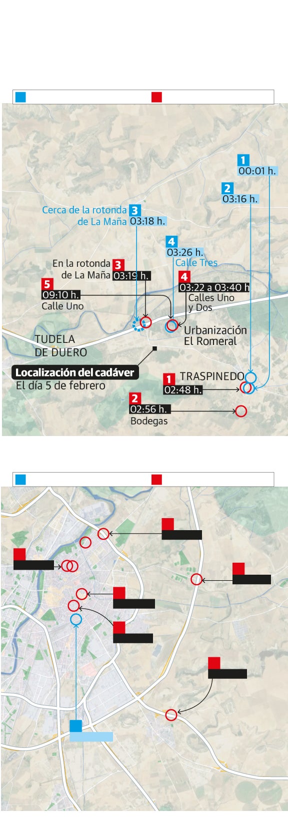 Las otras localizaciones fiables y contrastadas que se recogen en este informe sitúan el móvil de la joven horas antes en Traspinedo y sirven para confirmar el itinerario que siguió desde que fue a ver el partido con otros amigos al pub James Dean, cuando se fue al bar El Castillo a encontrarse con Lucio Carlos G., 'Carolo', y Óscar S. M. y, cuando cerraron los locales del pueblo se dirigieron a rematar sus consumiciones a la zona de las Bodegas. La señal sitúa el dispositivo a las 3:16 horas, aunque con una fiabilidad menor, en las inmediaciones del restaurante La Maña, en la N-122, donde supuestamente dejaron a Carolo y siguieron ruta en el T-Roc de Óscar S., quien aseguró que dejó a su amiga, que se había enfadado porque no quiso seguir de fiesta y se bajó del coche en el acceso a la Urbanización El Romeral. Según el sospechoso, esto habría ocurrido antes de las tres de la madrugada.