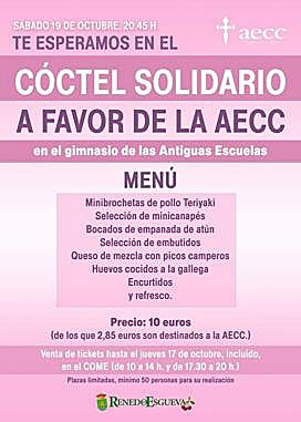 Renedo se tiñe de rosa este sábado por la tarde en beneficio de la Asociación Española Contra el Cáncer (AECC). Así, en el gimnasio de las antiguas escuelas en torno a las nueve menos cuarto de la noche, se celebrará un cóctel solidario en el que, por un precio de 10 euros (de los que se destinarán 2,85 euros), se pondrán degustar platos como minibrochetas de pollo, empanada de atún, embutidos y refresco.