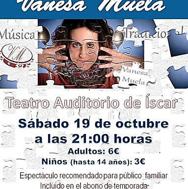 El teatro auditorio de Íscar acoge este sábado, a las nueve de la noche, un espectáculo dirigido a un público familiar a cargo de Vanesa Muela. El precio de entrada es de seis euros para adultos y de tres para niños hasta los catorce años.
