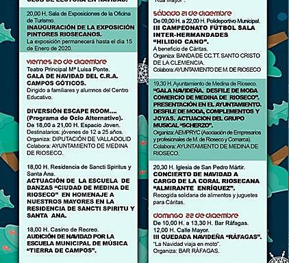 Medina de Rioseco se tiñe de Navidad. Este fin de semana, la localidad vallisoletana acoge numerosas actividades navideñas, tales como una audición musical (viernes, 18:00 horas), un campeonato de fútbol sala (sábado, 09:00 horas), concierto a cargo de una coral riosecana (sábado, 20:30 horas) o quedada motera navideña (domingo, 10:00 horas).