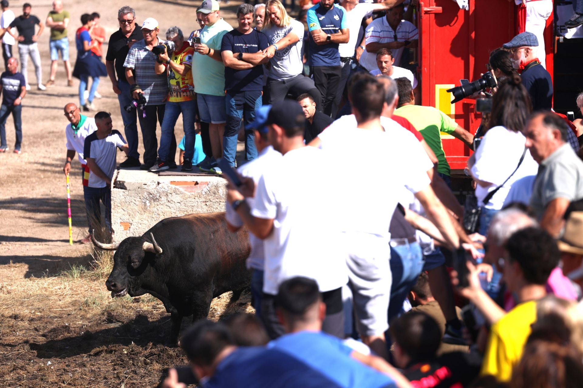 Cuando el toro parecía que no se iba a mover de allí, inició con un trote el regreso hacia el pueblo. Fue al alcanzar la zona del atalancado cuando empezó a arremeter con fuerza contra la empalizada de madera. En una de las embestidas consiguió levantar una talanquera y tirar a los espectadores que se encontraban en ella, aunque gracias a la rápida intervención de Juan Pérez Marciel y Luis Ángel Muelas, directores de lidia, consiguieron llevarse de allí al astado. El animal volvió al mismo lugar con la intención de poder salir del recorrido, y fue el rejoneador Sergio Vegas el que en una rápida acción consiguió llevar al toro a la grupa de su caballo, gesto recibido con una gran ovación por parte de los participantes, que pudieron ayudar a colocar las talanqueras en su sitio.