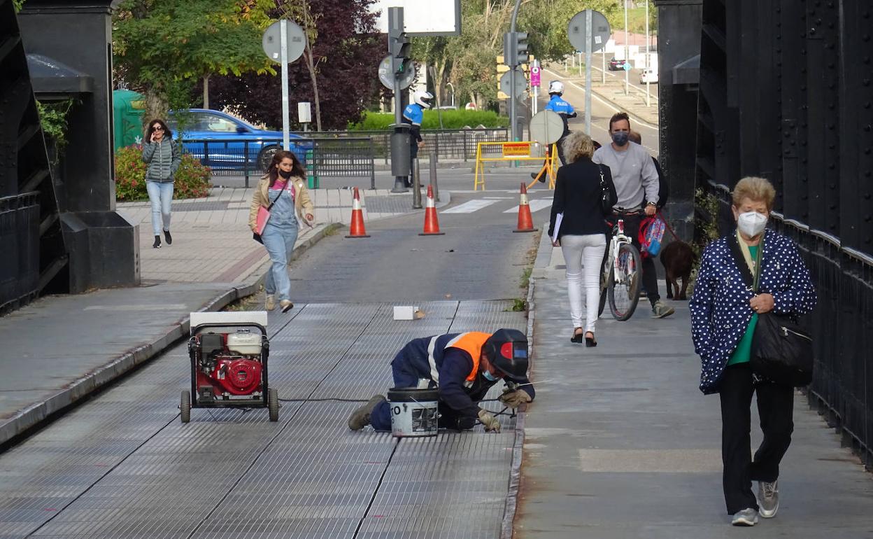 Los operarios, en una intervención que vienen realizando prácticamente cada seis meses en los últimos años, han soldado y asegurado de nuevo las rejillas y picado y renovado con una capa de mortero las grietas de las losetas de hormigón de las juntas de dilatación de las aceras. «Es una operación de mantenimiento habitual para asegurar los elementos que más sufren del puente», han confirmado fuentes municipales.