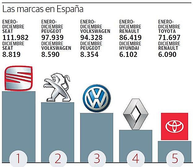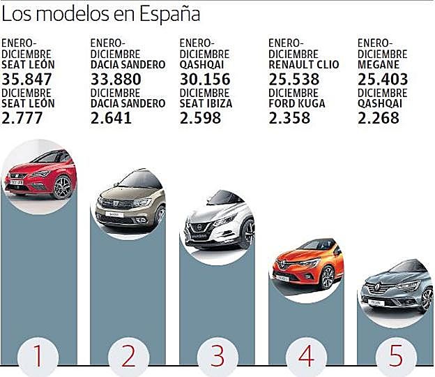 Por lo que respecta a los modelos de Renault, todos experimentaron caídas, sobre todo el Mégane (12,6%) y más moderadas en el caso del Captur (1,8%) y el Kadjar (1,3%). El coche fabricado en Valladolid registró 19.033 matriculaciones, mientras que el todoterreno urbano que se monta en Palencia sumó 12.269. La marca francesa fue la única que colocó dos modelos entre los cinco más vendidos en el año en España: el Clio, con 25.538 unidades y el Mégane, con 25.403. Además, el 'número dos' fue el Sandero, de Dacia, y el 'tres' el Qashqai, de su participada Nissan.