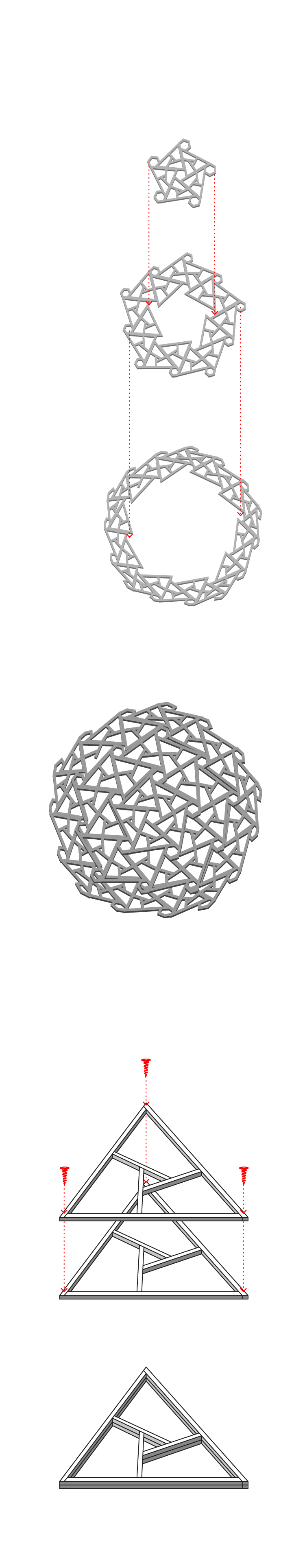 Las piezas que conforman la estructura son todas iguales. Forman un triángulo doble y se ensamblan unas a otra mediante tornillos.