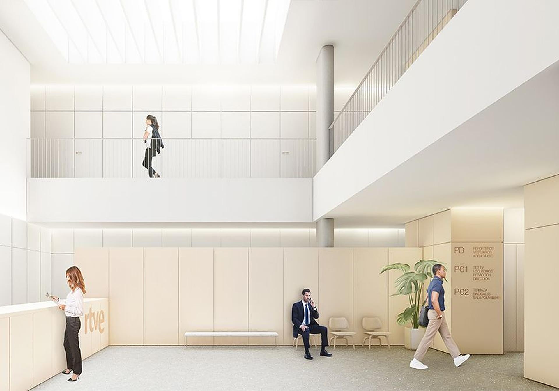 Dentro, de vuelta a la sede televisiva y radiofónica, en cuanto a su equipación, las instalaciones contarán con un set de televisión de 150 metros cuadrados, tres unidades de control y locución de radio, una de ellas con grabación de imágenes para televisión, dos cabinas de edición de vídeo y otras dos de locución. Todo ello en torno al citado vestíbulo central bajo un «gran atrio -solo allí, en una suerte de torreón que lucirá el logotipo de RTVE, alcanza el inmueble las tres alturas-» que «centralizará los accesos para controlarlos desde un único punto».