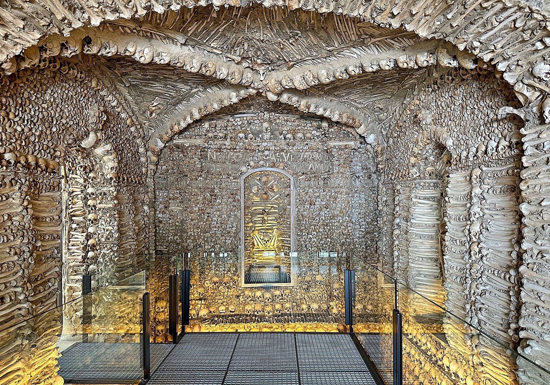 Nuestra siguiente parada, Campo Maior, tiene más de tragedia que de cuento. Su historia está marcada por un rayo, que provocó la explosión de su polvorín en 1732. Destruyó 836 de las 1.076 casas del pueblo, provocando 1.500 muertos. Junto a la iglesia parroquial está la inquietante Capilla de los Huesos, levantada en 1766 en memoria de las víctimas de la explosión. Los huesos de cerca de 800 cadáveres cubren las paredes y el techo. Una inscripción nos estremece: «Nós, ossos, que aquí estamos, pelos vossos esperamos».