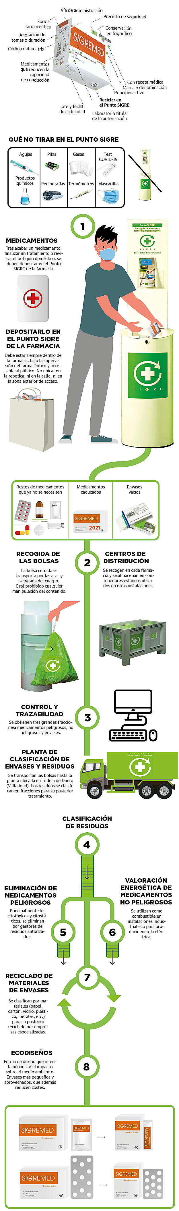 Porque en los más de 22.000 puntos Sigre de recogida de medicamentos instalados en farmacias de todo el país ni se dejan radiografías, ni antitérmicos para enviar a los países más pobres, ni mascarillas, ni test de antígenos... «Estos contenedores blancos son exclusivamente para medicamentos: pastillas, jarabes, colirios, cremas, cápsulas, ampollas, supositorios... Y se tienen que depositar tal cual en el punto de recogida, incluidos sus anexos. Es decir, se tira todo: el envase, la caja de cartón, el prospecto, la cucharita de medidas, la jeringa de plástico... Todo. No se debe hacer una separación previa porque eso ya lo hacemos nosotros en la planta de clasificación de envases y residuos que tenemos en la localidad vallisoletana de Tudela de Duero», explica Juan Carlos Mampaso, director general de Sigre.