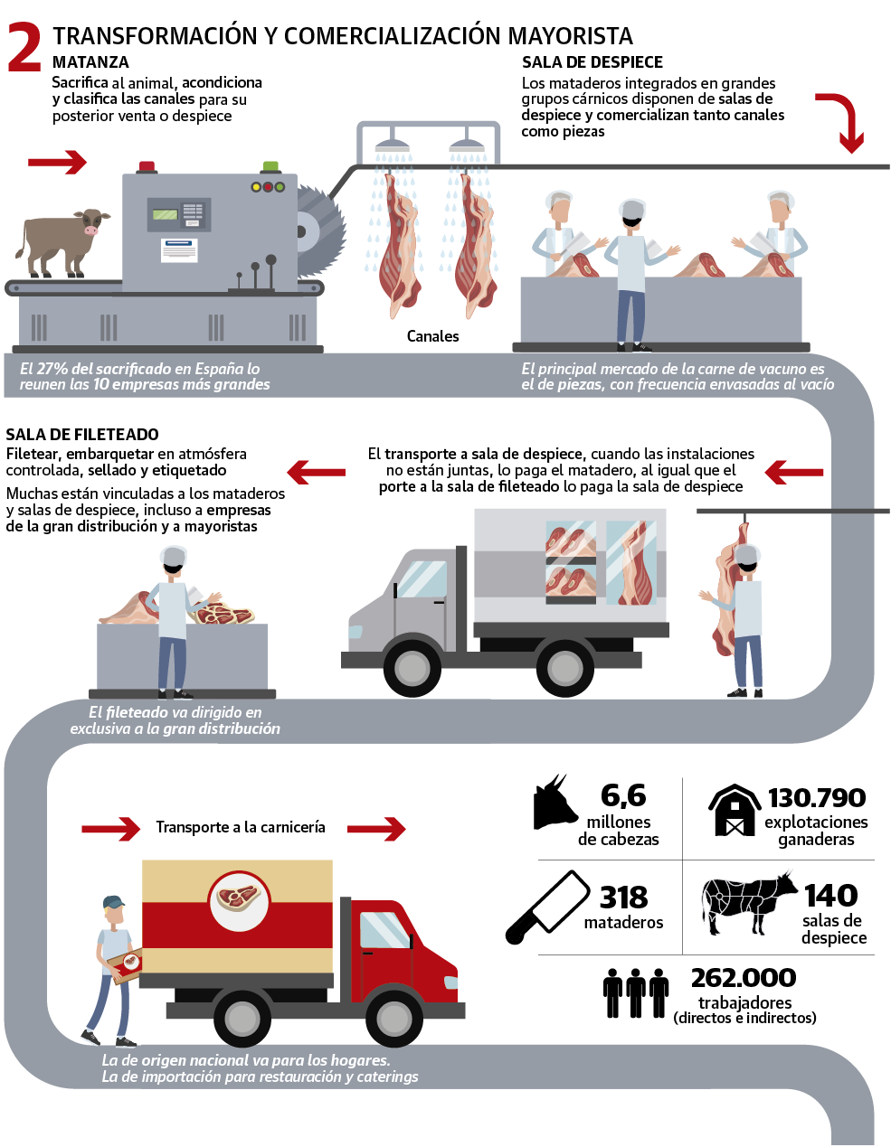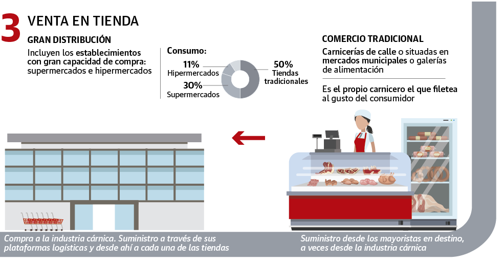 Pasados unos meses de ser alimentadas (y cuidadas; la salud es uno de los factores que más cuesta), entran en la cadena de la comercialización para el consumo. «Hoy, la mayoría de los ganaderos de cebo ya tienen cerrado el canal de comercialización», explica Moro. En España, muchos de ellos son a la vez carniceros que luego venden el producto en tiendas. Es el modelo imperante. De hecho, un 40% de la carne que se consume en España es nacional y se compra en carnicerías de barrio. Otro porcentaje se vende en supermercados y grandes superficies y, finalmente, la carne de importación llega a través de parte de la restauración y las empresas de caterings que sirven en colegios, hospitales y otras instituciones.