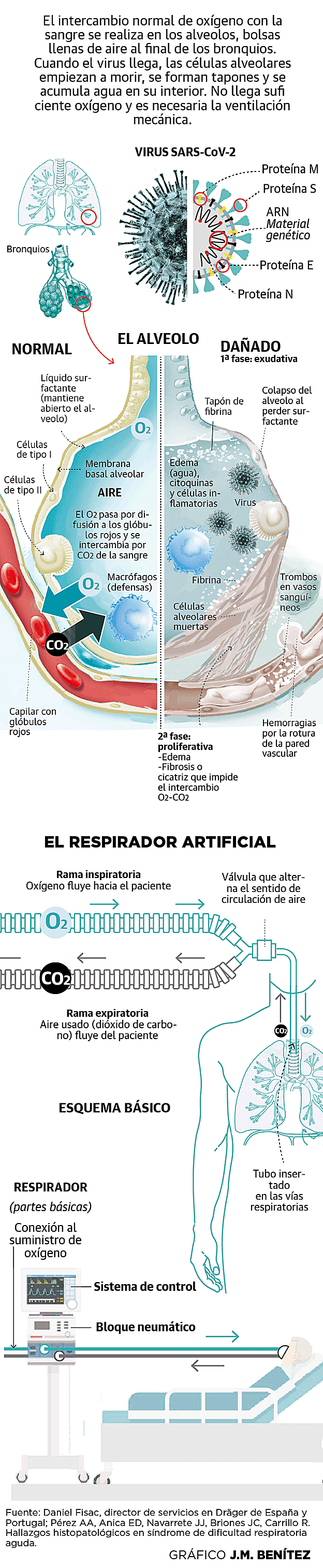 Esto mismo puede ocurrir en cualquier célula del cuerpo, pero el SARS-Cov-2 tiene especial predilección por las células pulmonares. Por eso, los síntomas más comunes de la COVID-19 son tos seca, fiebre, neumonía o síndrome de distrés respiratorio. Esta última patología se produce cuando el virus daña un gran porcentaje de los 500 millones de alveolos de un adulto –bolsas diminutas de aire donde se produce el intercambio de oxígeno (O2) y dióxido de carbono (CO2) entre los pulmones y el torrente sanguíneo– y provoca una inflamación desmesurada que impide que la respiración natural sea suficiente para mantener la vida. Ahí es cuando se hace necesaria la ventilación mecánica, es decir, un respirador artificial.